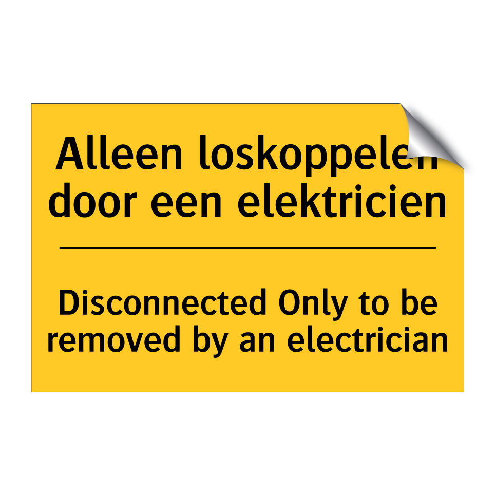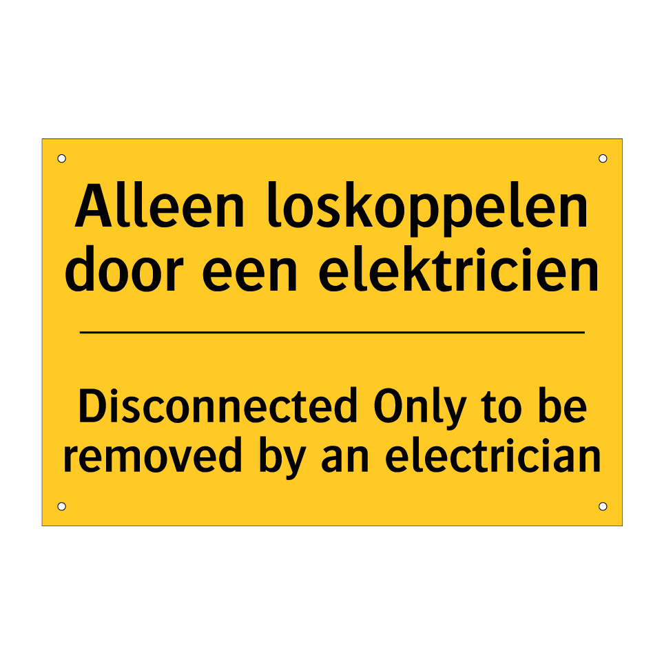 Waarschuwingsbord met de tekst Alleen loskoppelen door een elektricien / Disconnected Only to be removed by an electrician