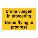 Waarschuwingsbord met de tekst Drone vliegen in uitvoering / Drone flying in progress