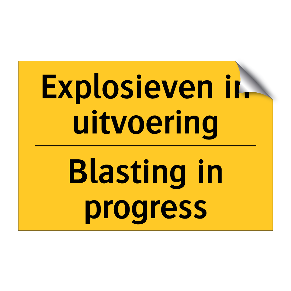 Waarschuwingsbord met de tekst Explosieven in uitvoering / Blasting in progress