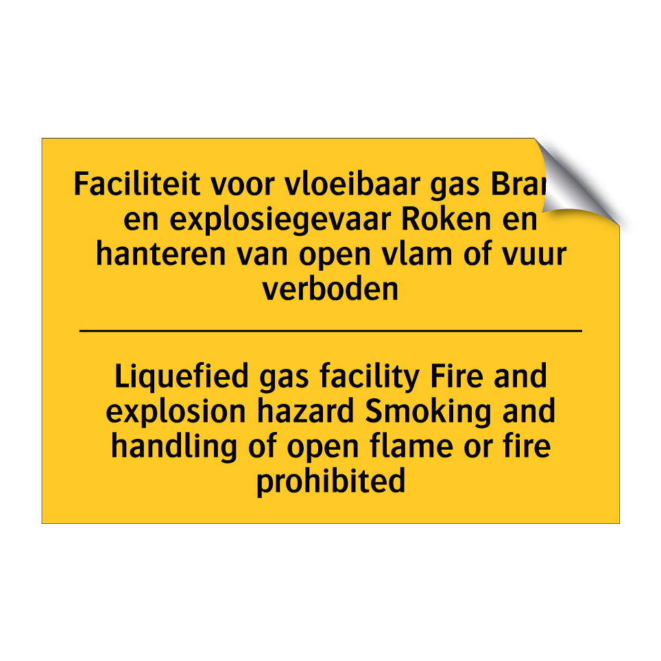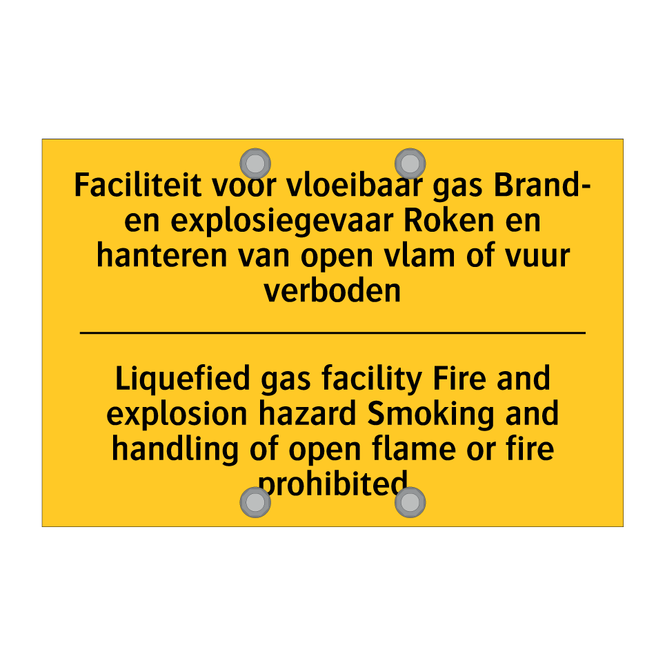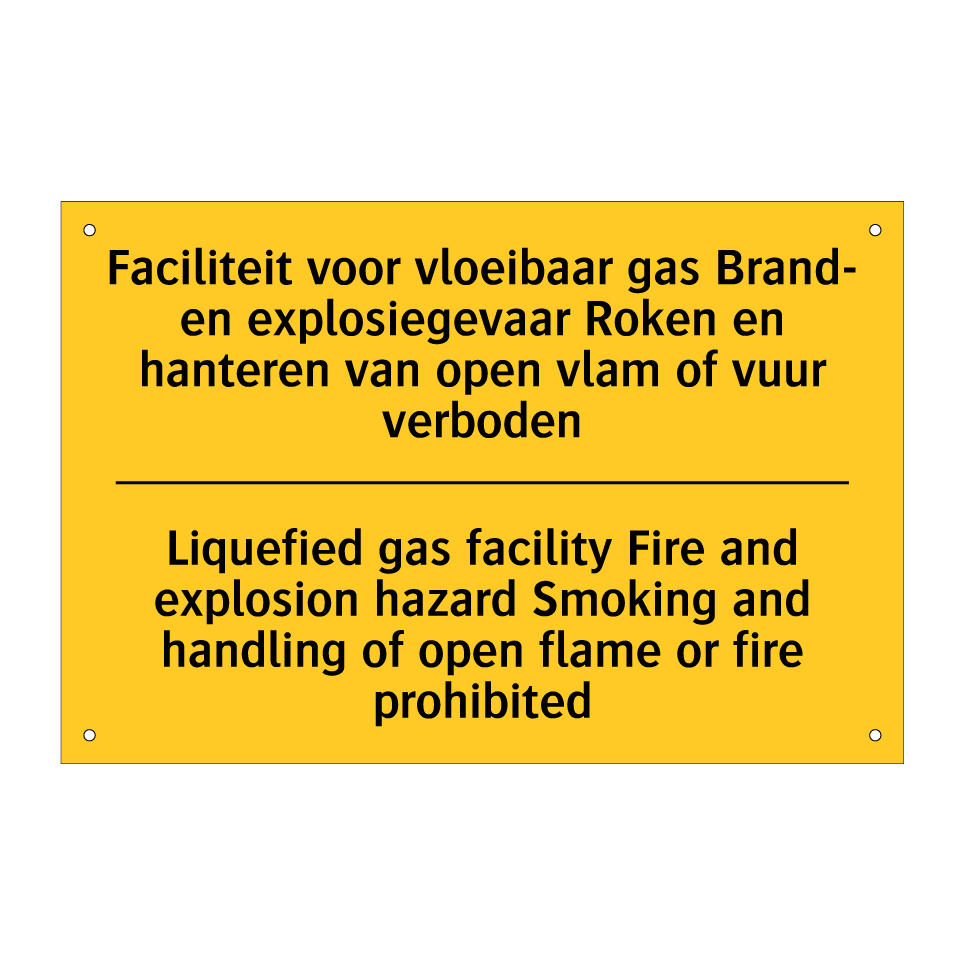 Waarschuwingsbord met de tekst Faciliteit voor vloeibaar gas Brand- en explosiegevaar Roken en hanteren van open vlam of vuur verboden / Liquefied gas facility Fire and explosion hazard Smoking and handling of open flame or fire prohibited