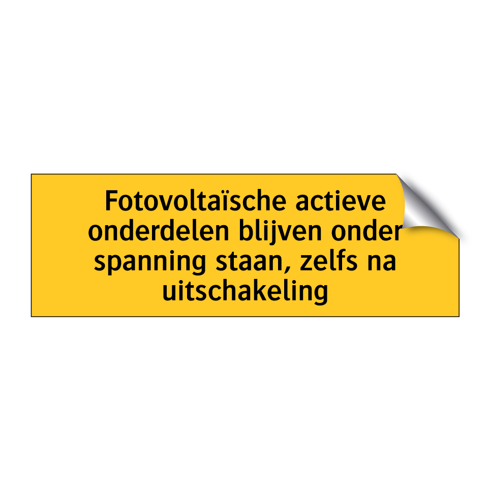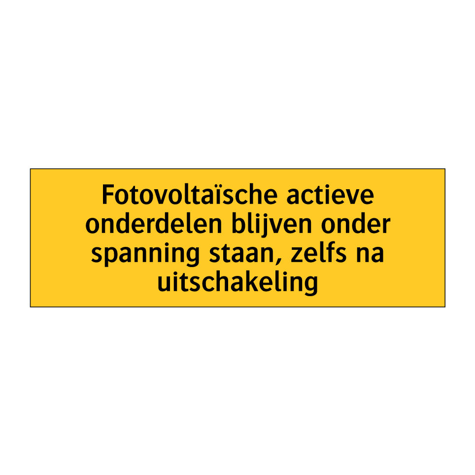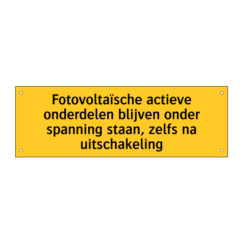 Waarschuwingsbord met de tekst Fotovoltaïsche actieve onderdelen blijven onder spanning staan, zelfs na uitschakeling