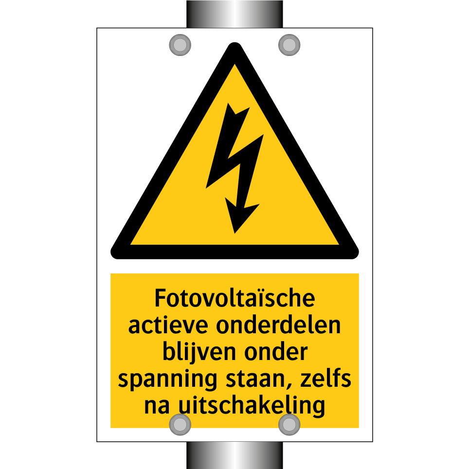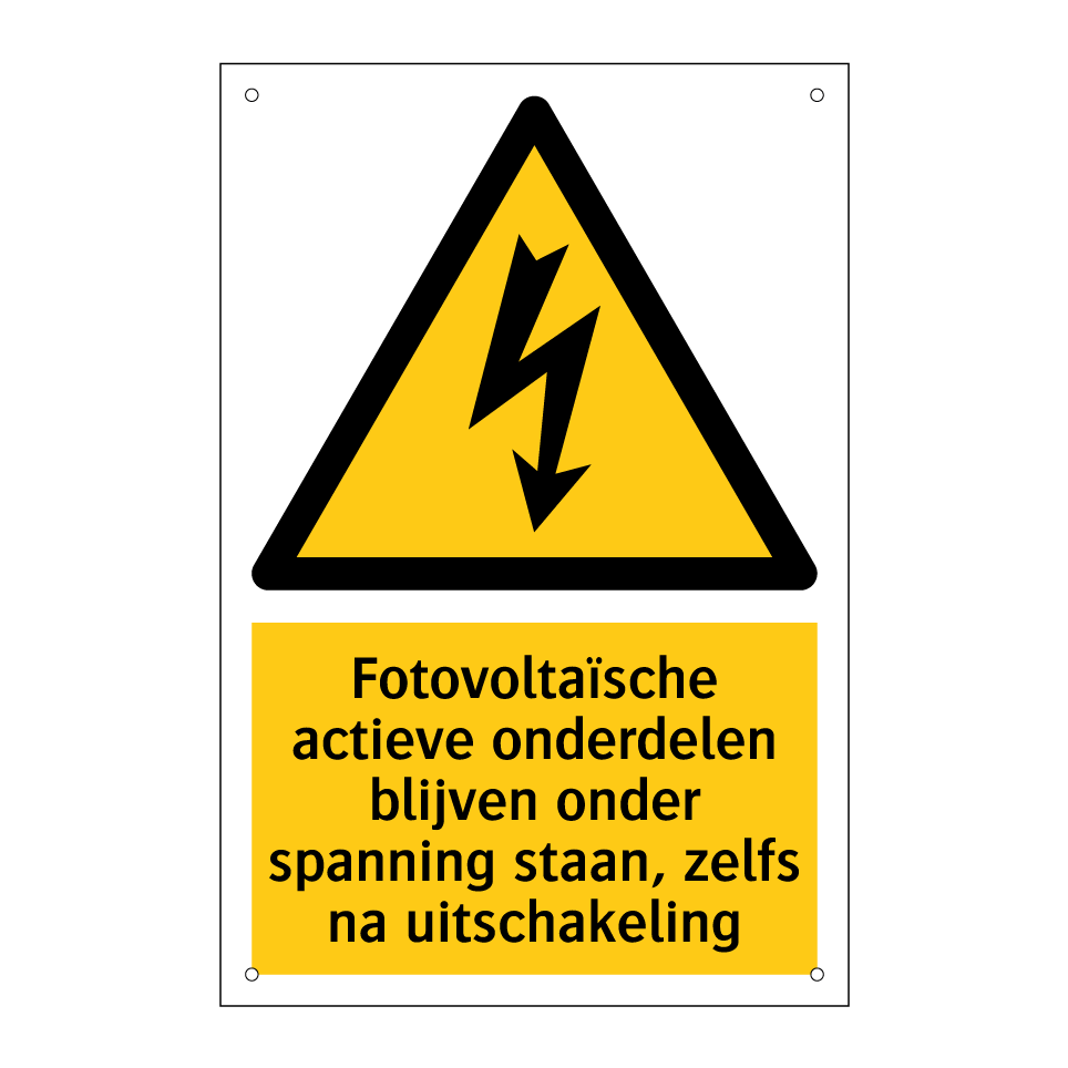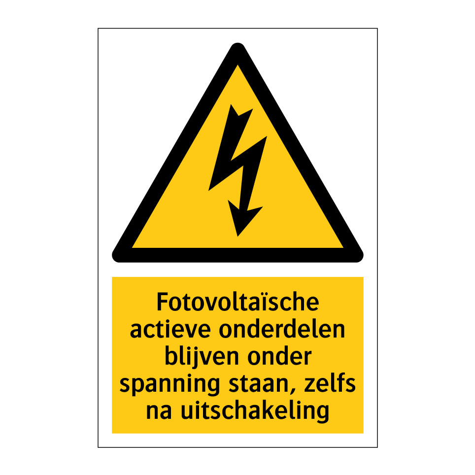 Waarschuwingsbord met de tekst Fotovoltaïsche actieve onderdelen blijven onder spanning staan, zelfs na uitschakeling