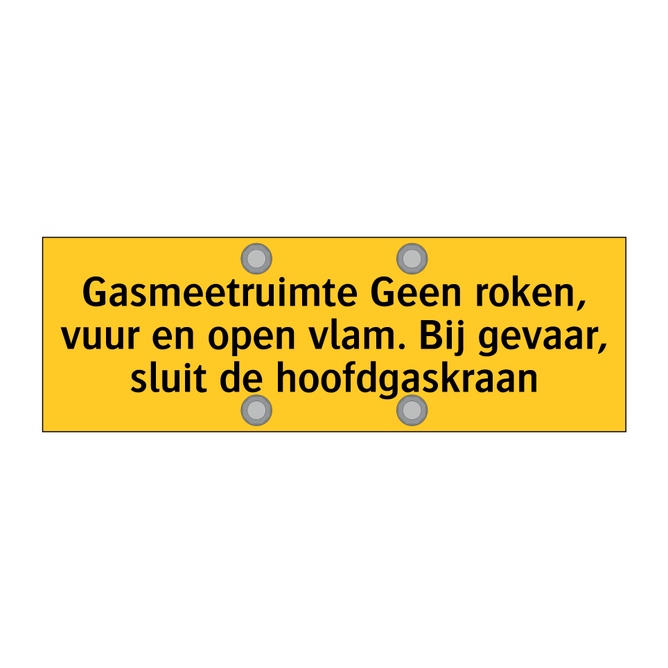 Waarschuwingsbord met de tekst Gasmeetruimte Geen roken, vuur en open vlam. Bij gevaar, sluit de hoofdgaskraan