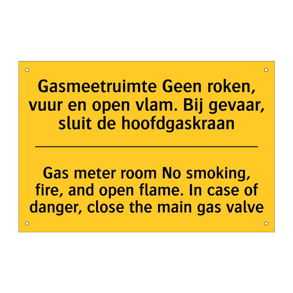 Waarschuwingsbord met de tekst Gasmeetruimte Geen roken, vuur en open vlam. Bij gevaar, sluit de hoofdgaskraan / Gas meter room No smoking, fire, and open flame. In case of danger, close the main gas valve