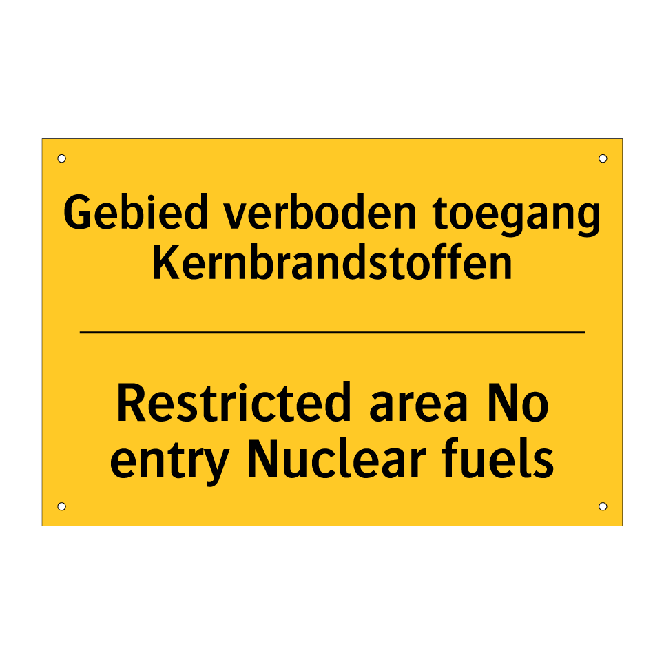 Waarschuwingsbord met de tekst Gebied verboden toegang Kernbrandstoffen / Restricted area No entry Nuclear fuels