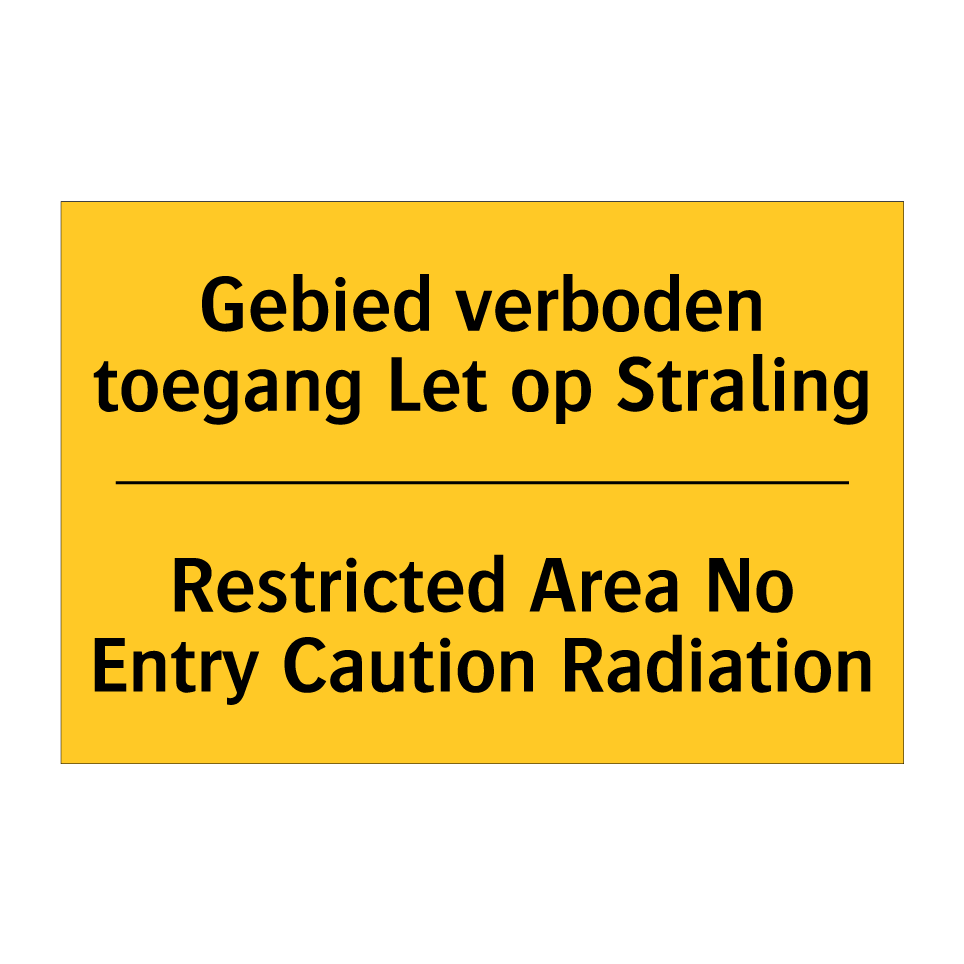 Waarschuwingsbord met de tekst Gebied verboden toegang Let op Straling / Restricted Area No Entry Caution Radiation