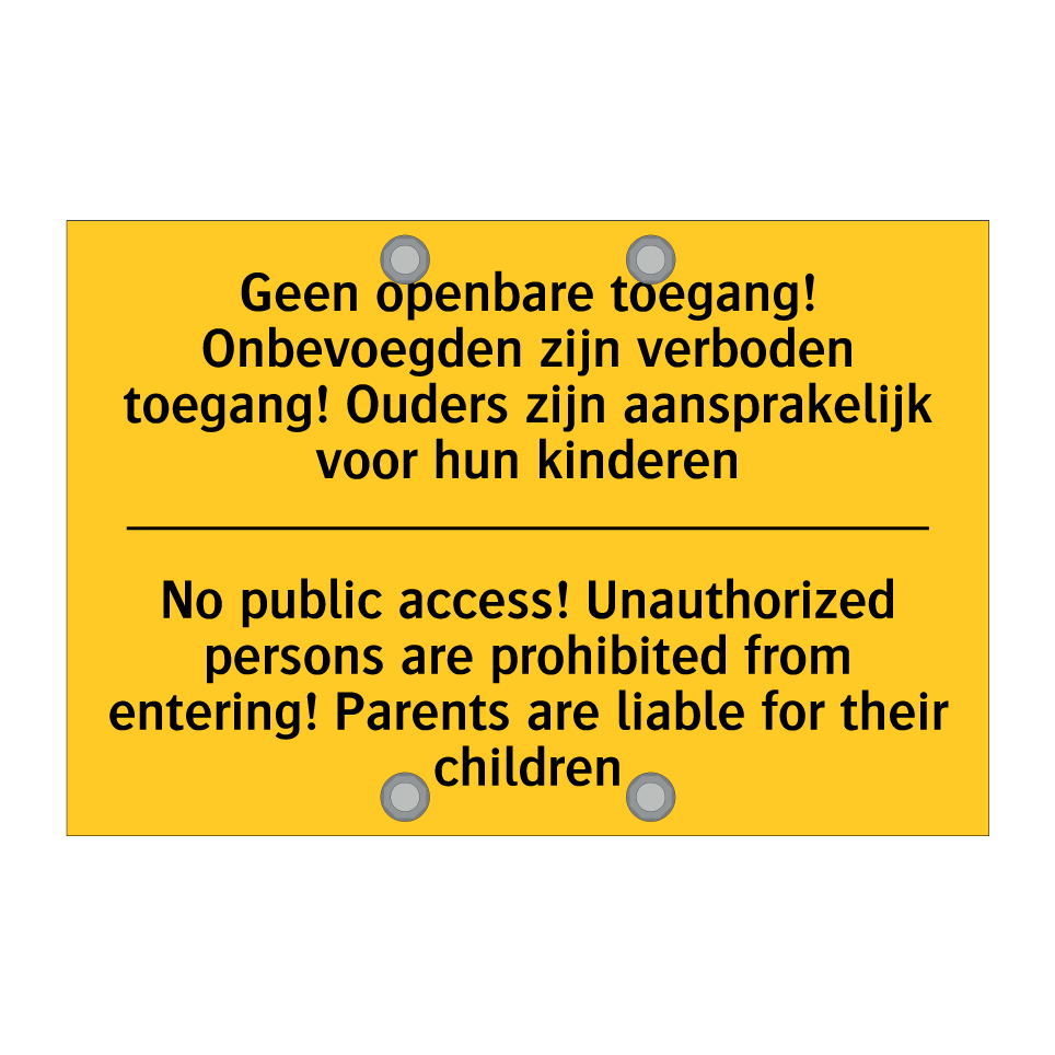 Waarschuwingsbord met de tekst Geen openbare toegang! Onbevoegden zijn verboden toegang! Ouders zijn aansprakelijk voor hun kinderen / No public access! Unauthorized persons are prohibited from entering! Parents are liable for their children