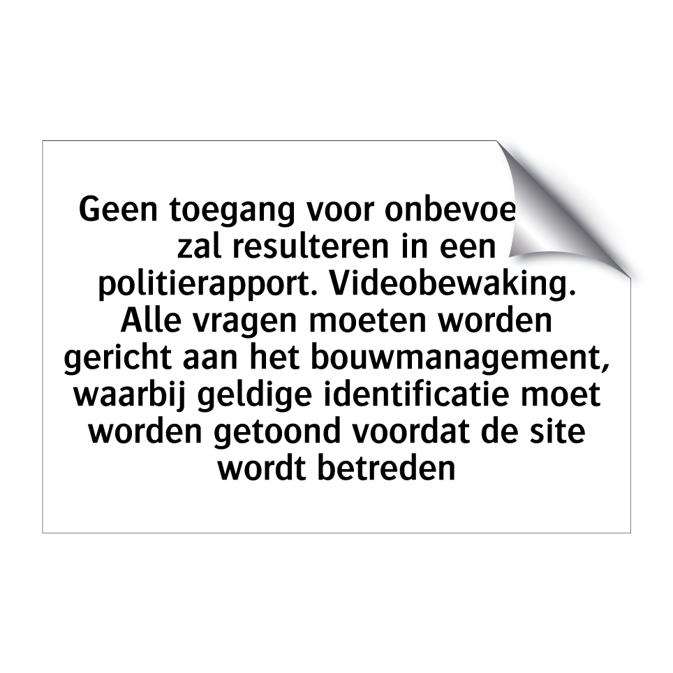 Verbodsbord met de tekst Geen toegang voor onbevoegden zal resulteren in een politierapport. Videobewaking. Alle vragen moeten worden gericht aan het bouwmanagement, waarbij geldige identificatie moet worden getoond voordat de site wordt betreden