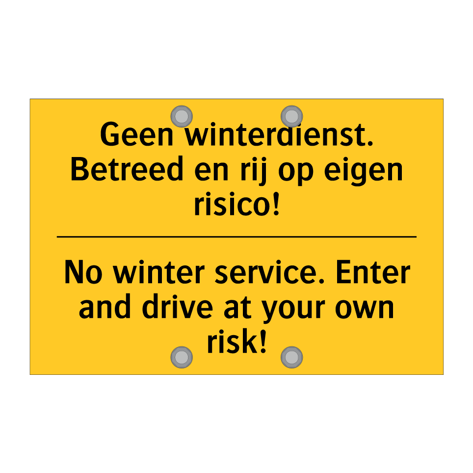Waarschuwingsbord met de tekst Geen winterdienst. Betreed en rij op eigen risico! / No winter service. Enter and drive at your own risk!