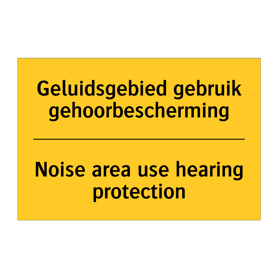 Waarschuwingsbord met de tekst Geluidsgebied gebruik gehoorbescherming / Noise area use hearing protection