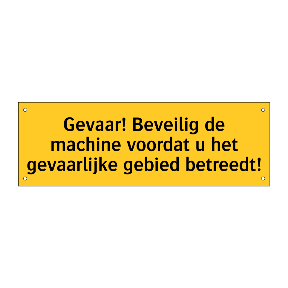 Waarschuwingsbord met de tekst Gevaar! Beveilig de machine voordat u het gevaarlijke gebied betreedt!