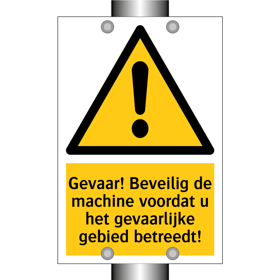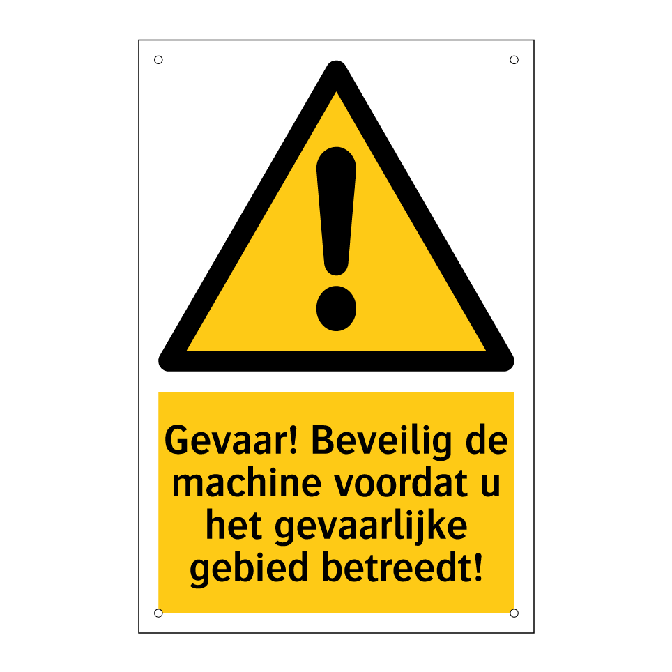 Waarschuwingsbord met de tekst Gevaar! Beveilig de machine voordat u het gevaarlijke gebied betreedt!