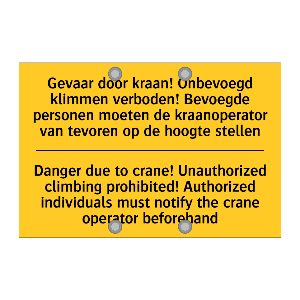 Waarschuwingsbord met de tekst Gevaar door kraan! Onbevoegd klimmen verboden! Bevoegde personen moeten de kraanoperator van tevoren op de hoogte stellen / Danger due to crane! Unauthorized climbing prohibited! Authorized individuals must notify the crane operator beforehand