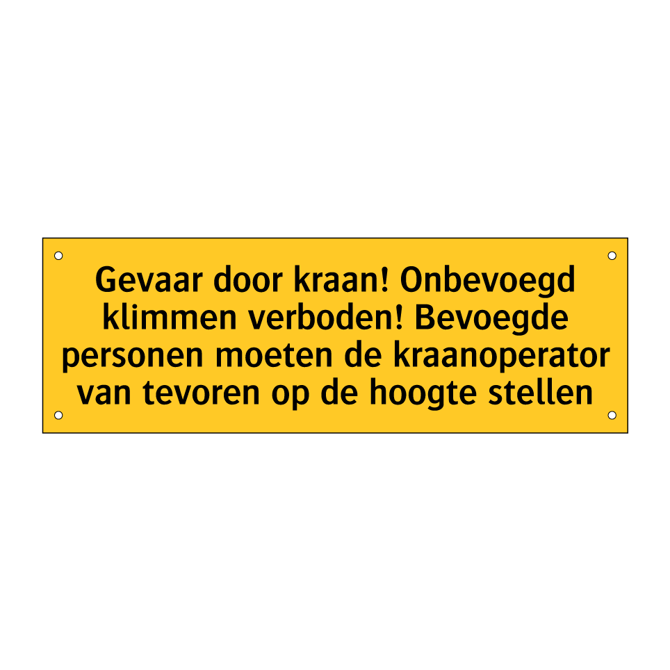 Deze waarschuwingsbord is essentieel voor de veiligheid op bouwplaatsen en industriële omgevingen waar kranen worden gebruikt. Het waarschuwt onbevoegde personen om niet te klimmen en benadrukt dat bevoegde personen de kraanoperator vooraf moeten informeren. Plaats deze bord op goed zichtbare locaties zoals bij de ingang van de bouwplaats, nabij de kraan of op andere strategische plekken waar mensen toegang proberen te krijgen. Dit waarschuwingsbord helpt ongelukken te voorkomen en zorgt ervoor dat alleen getrainde en geïnformeerde personen toegang hebben tot de kraan. De opvallende gele achtergrond met zwarte tekst zorgt ervoor dat de boodschap duidelijk en direct is.