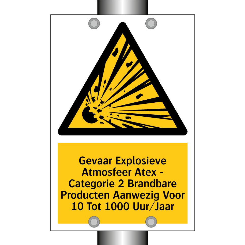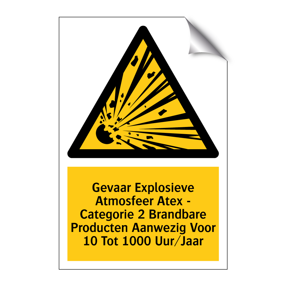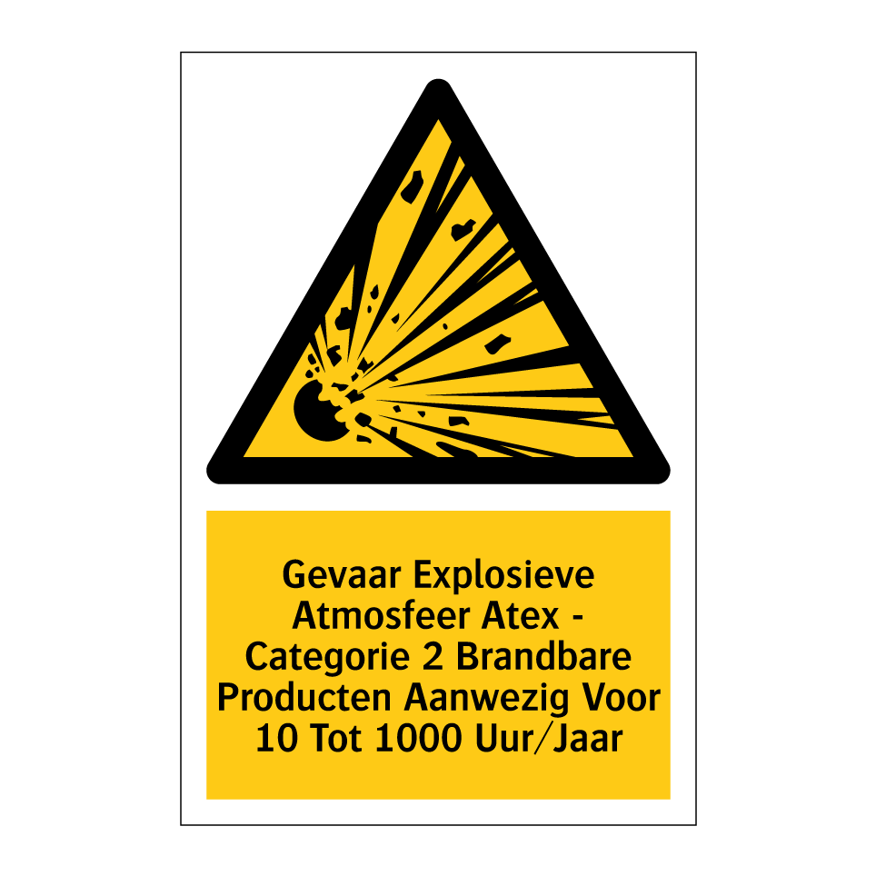 Waarschuwingsbord met de tekst Gevaar Explosieve Atmosfeer Atex - Categorie 2 Brandbare Producten Aanwezig Voor 10 Tot 1000 Uur/Jaar