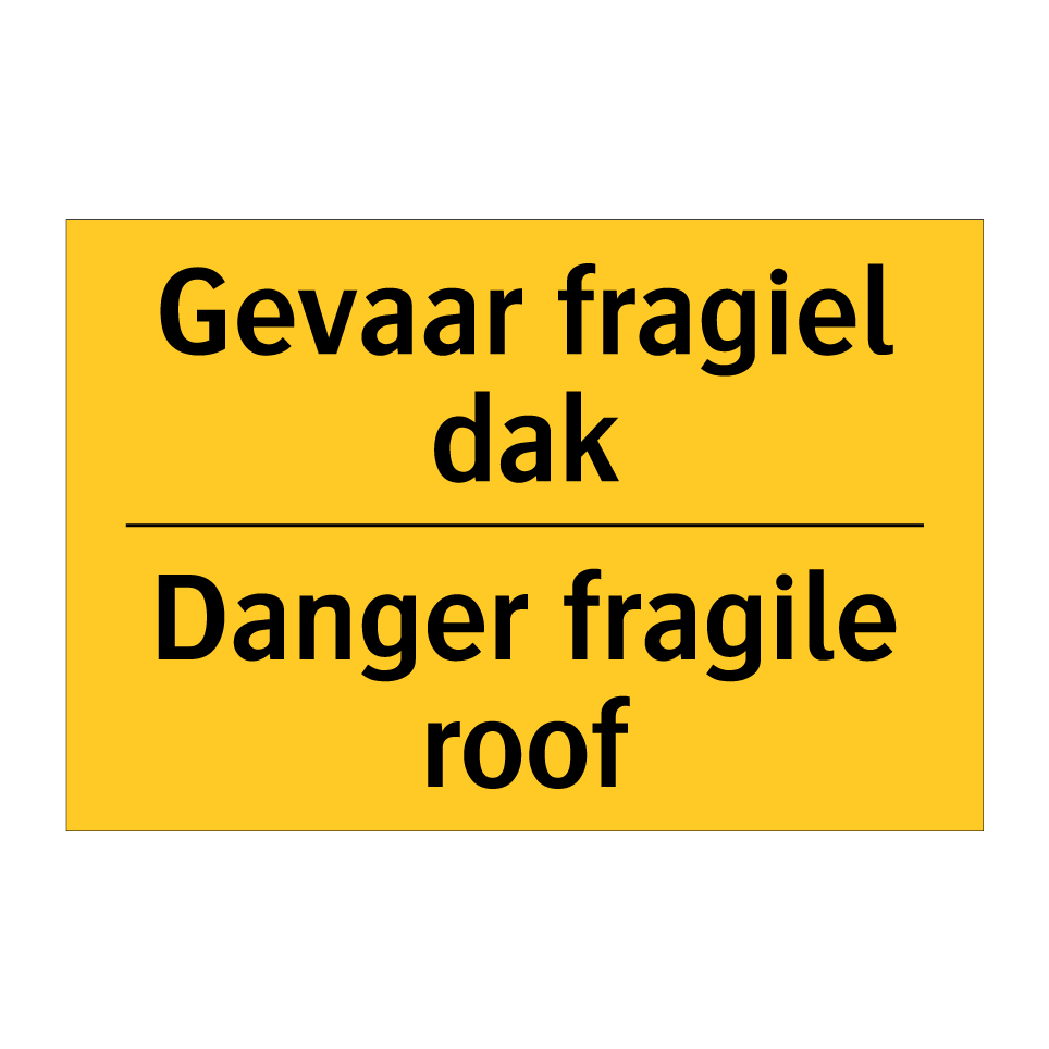 Dit waarschuwingsbord met gele achtergrond en zwarte tekst is ideaal voor het markeren van gevaarlijke zones met een fragiel dak. De tweetalige tekst in zowel Nederlands als Engels zorgt ervoor dat zowel lokale als internationale werknemers en bezoekers de waarschuwing begrijpen. dit bordje is perfect voor gebruik op bouwplaatsen, industriële gebieden en andere locaties waar kwetsbare daken aanwezig zijn. Door de duidelijke en opvallende kleuren trekt het direct de aandacht en helpt het ongelukken te voorkomen. Plaats dit waarschuwingsbord op goed zichtbare plekken zoals ingangen, trappenhuizen of nabij het fragiele dak zelf om maximale veiligheid te garanderen.