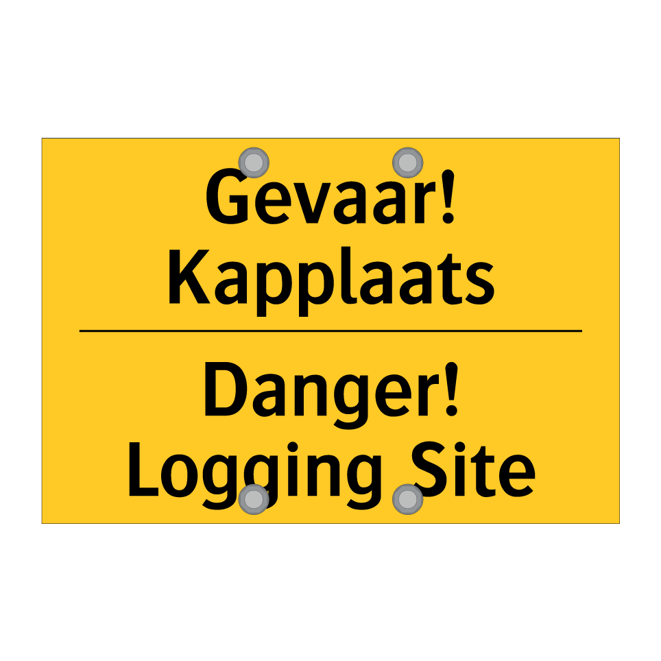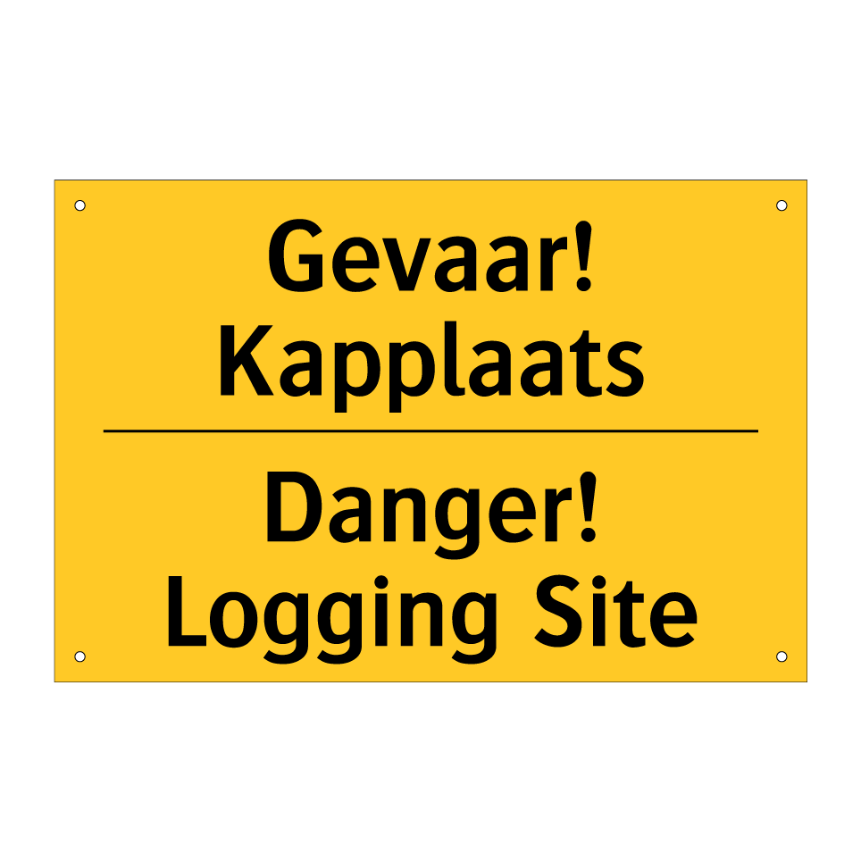 Waarschuwingsbord met de tekst Gevaar! Kapplaats / Danger! Logging Site