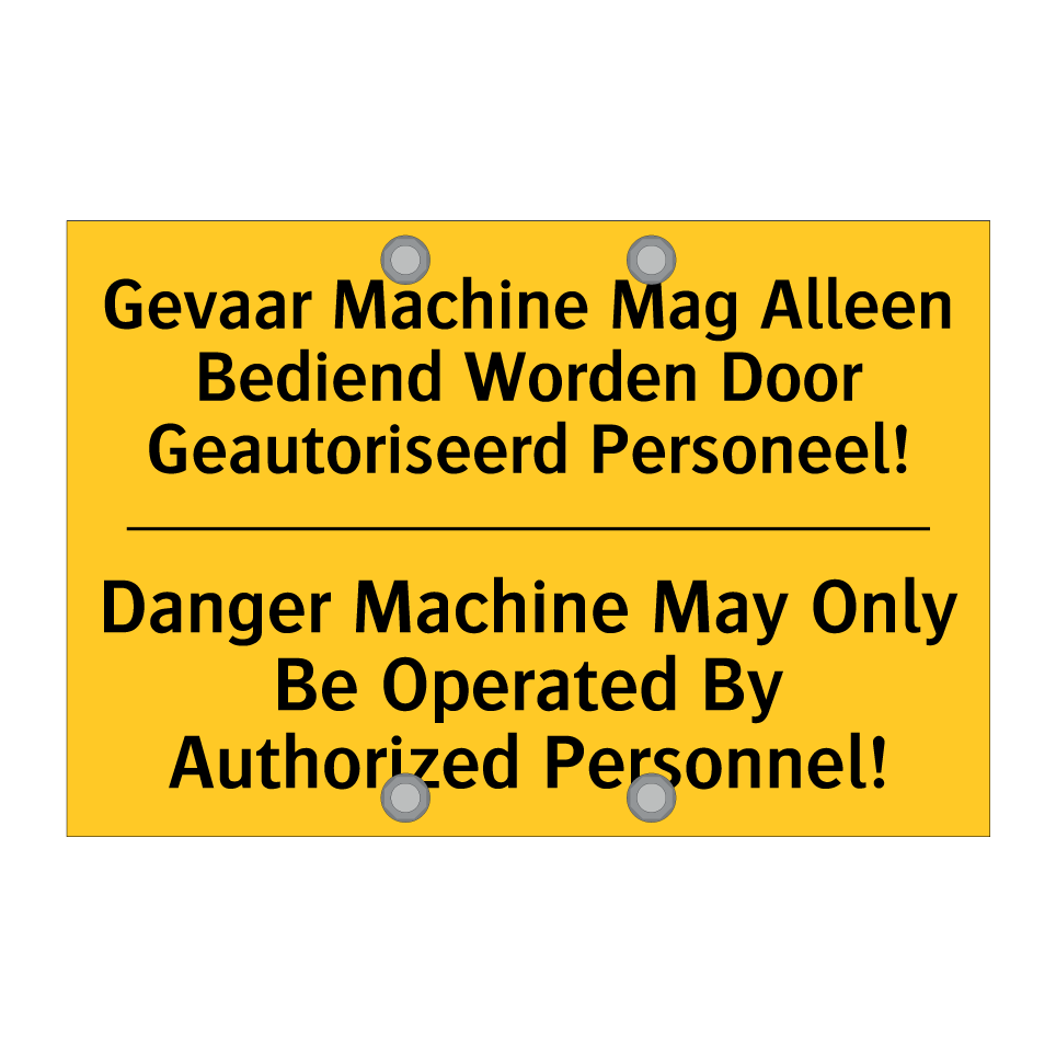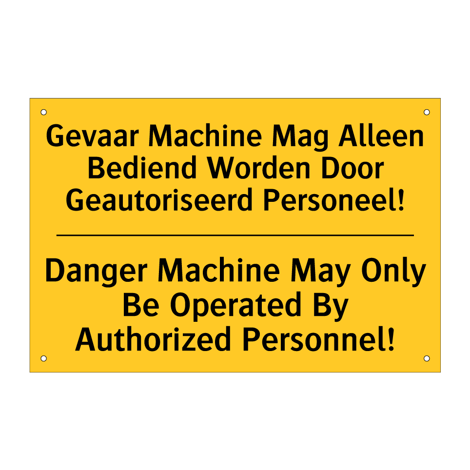 Waarschuwingsbord met de tekst Gevaar Machine Mag Alleen Bediend Worden Door Geautoriseerd Personeel! / Danger Machine May Only Be Operated By Authorized Personnel!