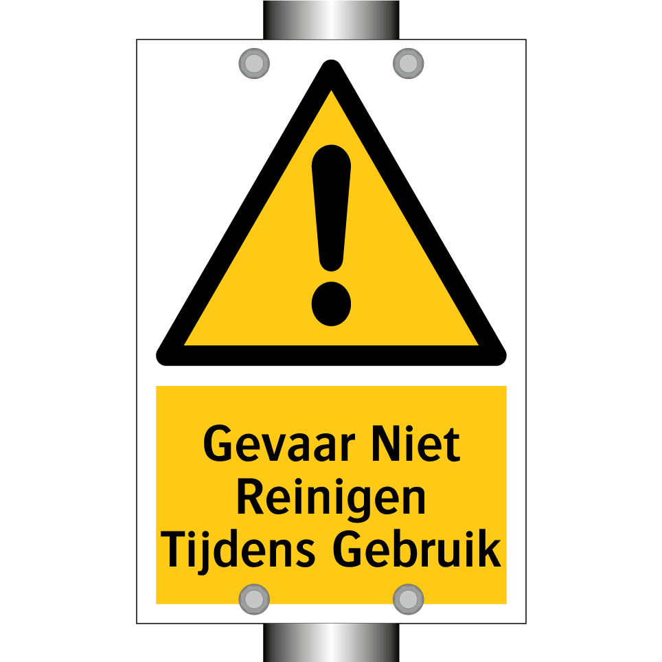Waarschuwingsbord met de tekst Gevaar Niet Reinigen Tijdens Gebruik