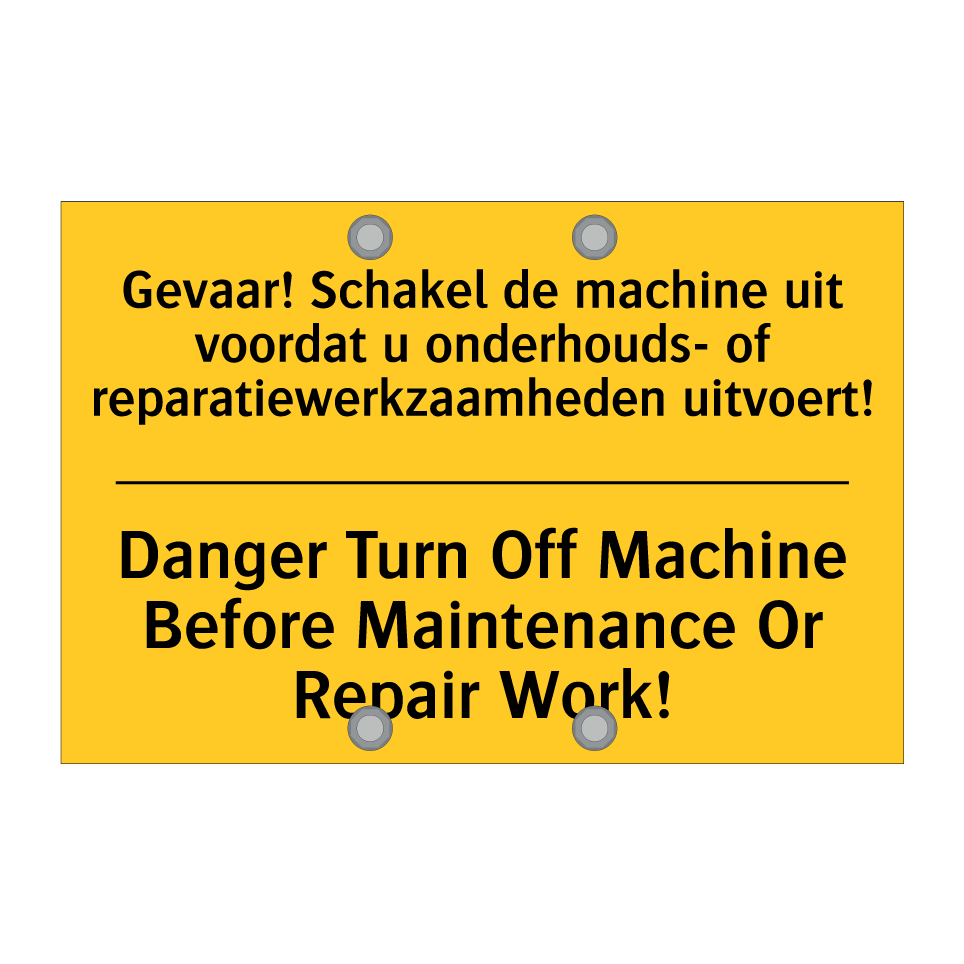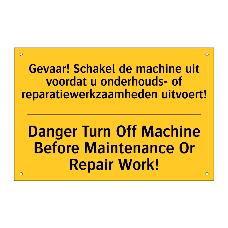 Waarschuwingsbord met de tekst Gevaar! Schakel de machine uit voordat u onderhouds- of reparatiewerkzaamheden uitvoert! / Danger Turn Off Machine Before Maintenance Or Repair Work!