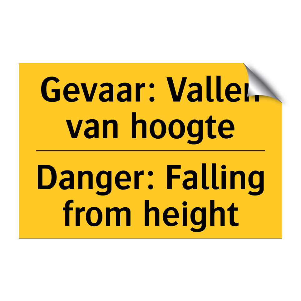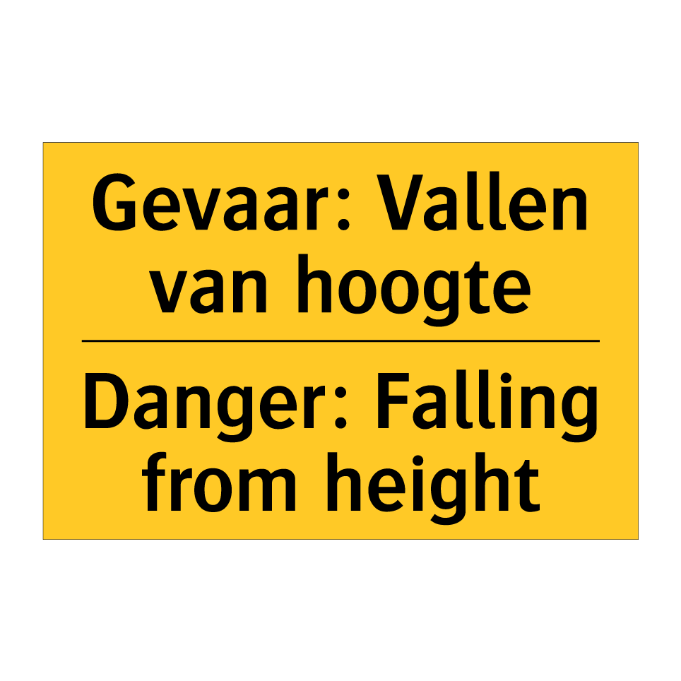Dit waarschuwingsbord met gele achtergrond en zwarte tekst is essentieel voor het waarborgen van de veiligheid op locaties waar valgevaar bestaat. De tweetalige tekst in zowel Nederlands als Engels maakt het bord ideaal voor internationale werkomgevingen, zoals bouwplaatsen, magazijnen en industriële gebieden. Door de duidelijke waarschuwing in twee talen, wordt de kans op misverstanden verminderd en wordt de veiligheid van alle werknemers gewaarborgd. Plaats dit bordje op strategische plekken zoals bij trappen, steigers en andere hooggelegen werkplekken om ongelukken te voorkomen. Dit waarschuwingsbord is een onmisbaar hulpmiddel voor elke werkplek waar hoogte een risico vormt.