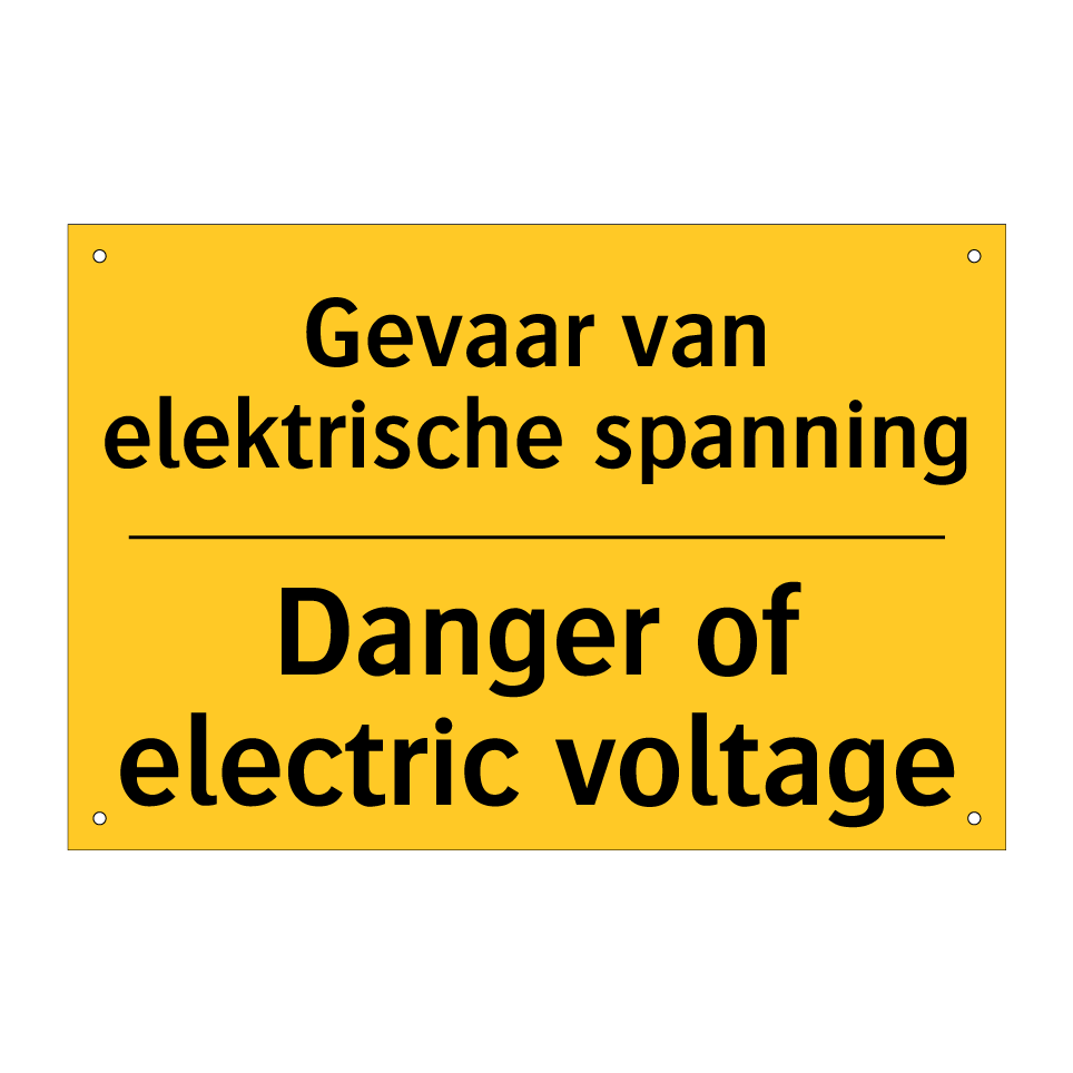 Deze waarschuwingsbord met gele achtergrond en zwarte tekst is ideaal voor het markeren van gebieden met elektrische spanning. De tweetalige tekst in zowel Nederlands als Engels zorgt ervoor dat de boodschap duidelijk is voor een breder publiek, wat de veiligheid verhoogt. Plaats dit bordje in technische ruimtes, bij elektrische installaties of in de buurt van hoogspanningsapparatuur om personeel en bezoekers te waarschuwen voor mogelijke gevaren. Dit waarschuwingsbord is essentieel voor elke omgeving waar elektrische risico's aanwezig zijn, zoals fabrieken, werkplaatsen en bouwplaatsen. Door de opvallende kleuren en duidelijke tekst trekt het direct de aandacht en helpt het ongelukken te voorkomen.