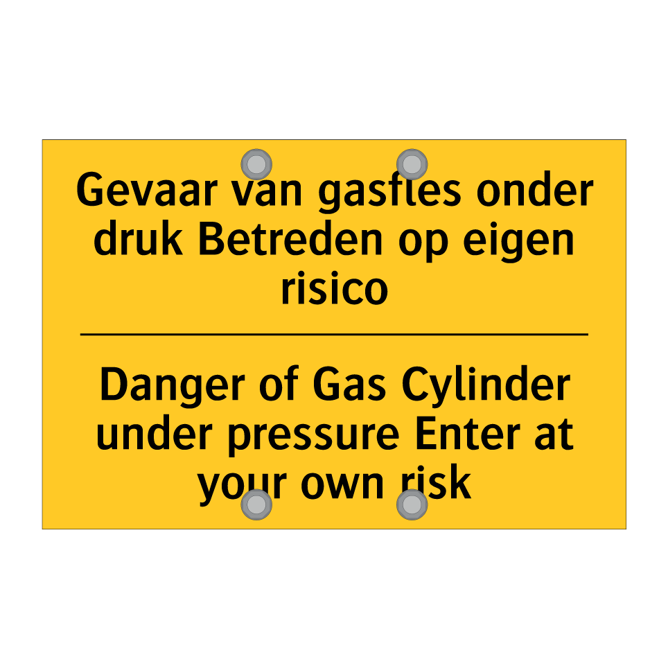 Waarschuwingsbord met de tekst Gevaar van gasfles onder druk Betreden op eigen risico / Danger of Gas Cylinder under pressure Enter at your own risk