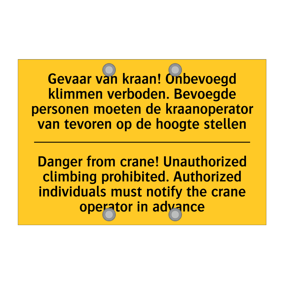 Waarschuwingsbord met de tekst Gevaar van kraan! Onbevoegd klimmen verboden. Bevoegde personen moeten de kraanoperator van tevoren op de hoogte stellen / Danger from crane! Unauthorized climbing prohibited. Authorized individuals must notify the crane operator in advance