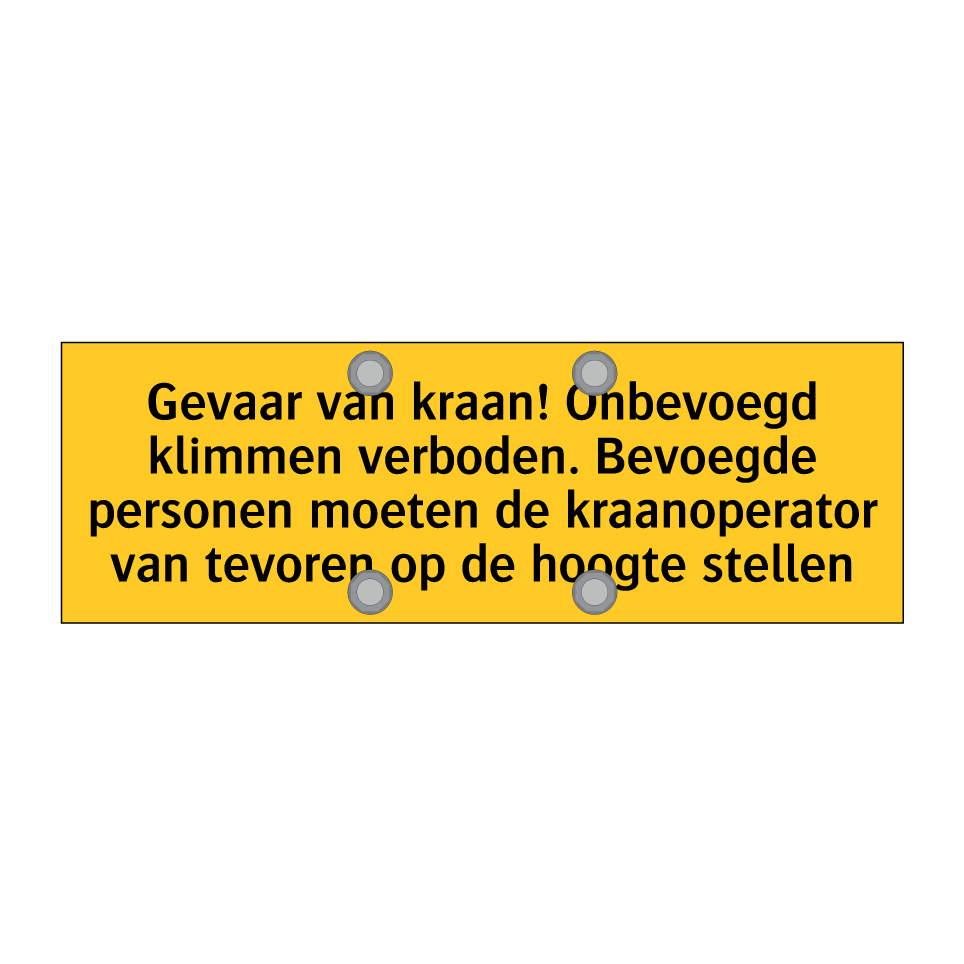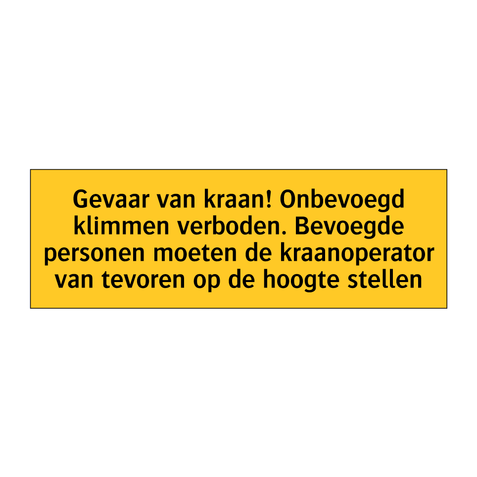 Waarschuwingsbord met de tekst Gevaar van kraan! Onbevoegd klimmen verboden. Bevoegde personen moeten de kraanoperator van tevoren op de hoogte stellen