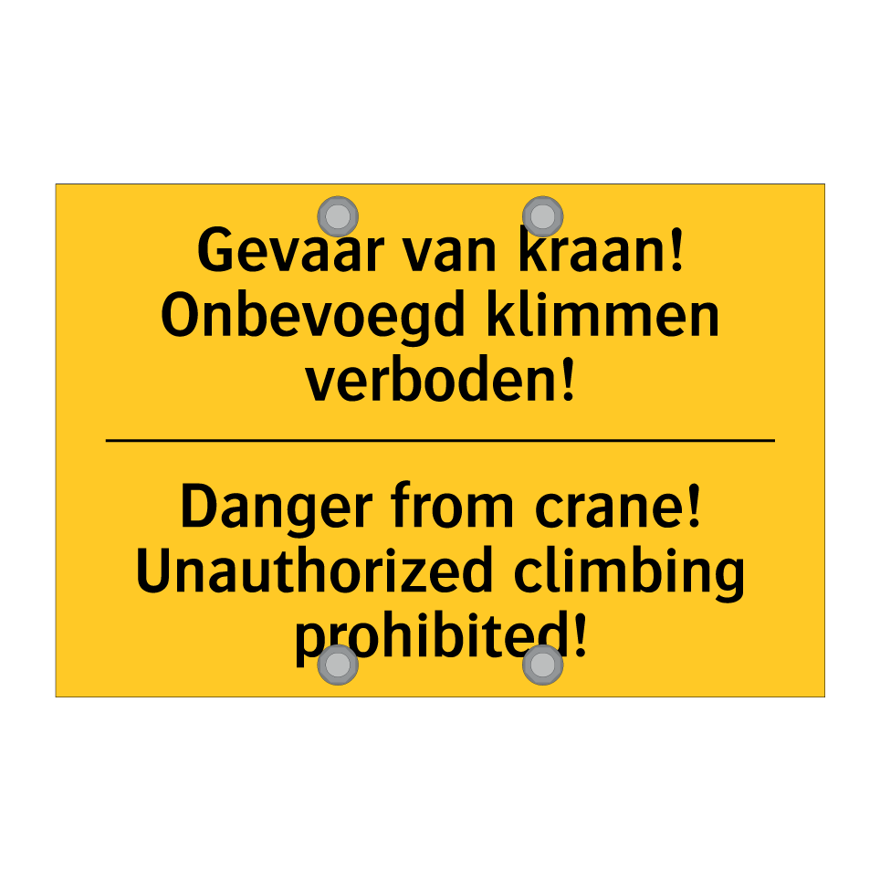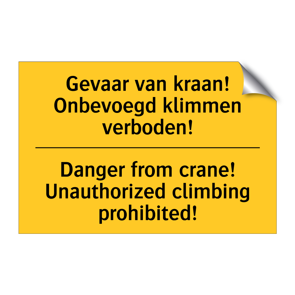 Waarschuwingsbord met de tekst Gevaar van kraan! Onbevoegd klimmen verboden! / Danger from crane! Unauthorized climbing prohibited!