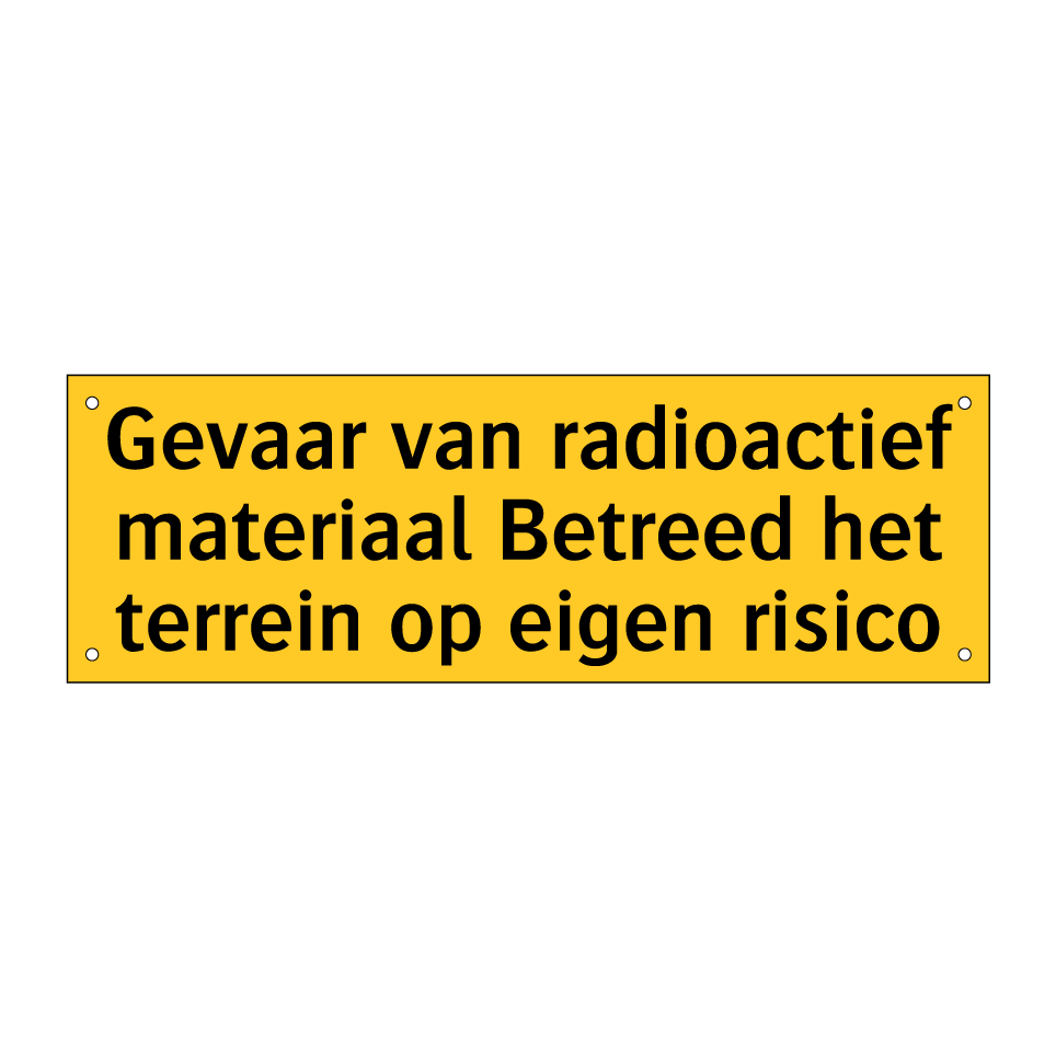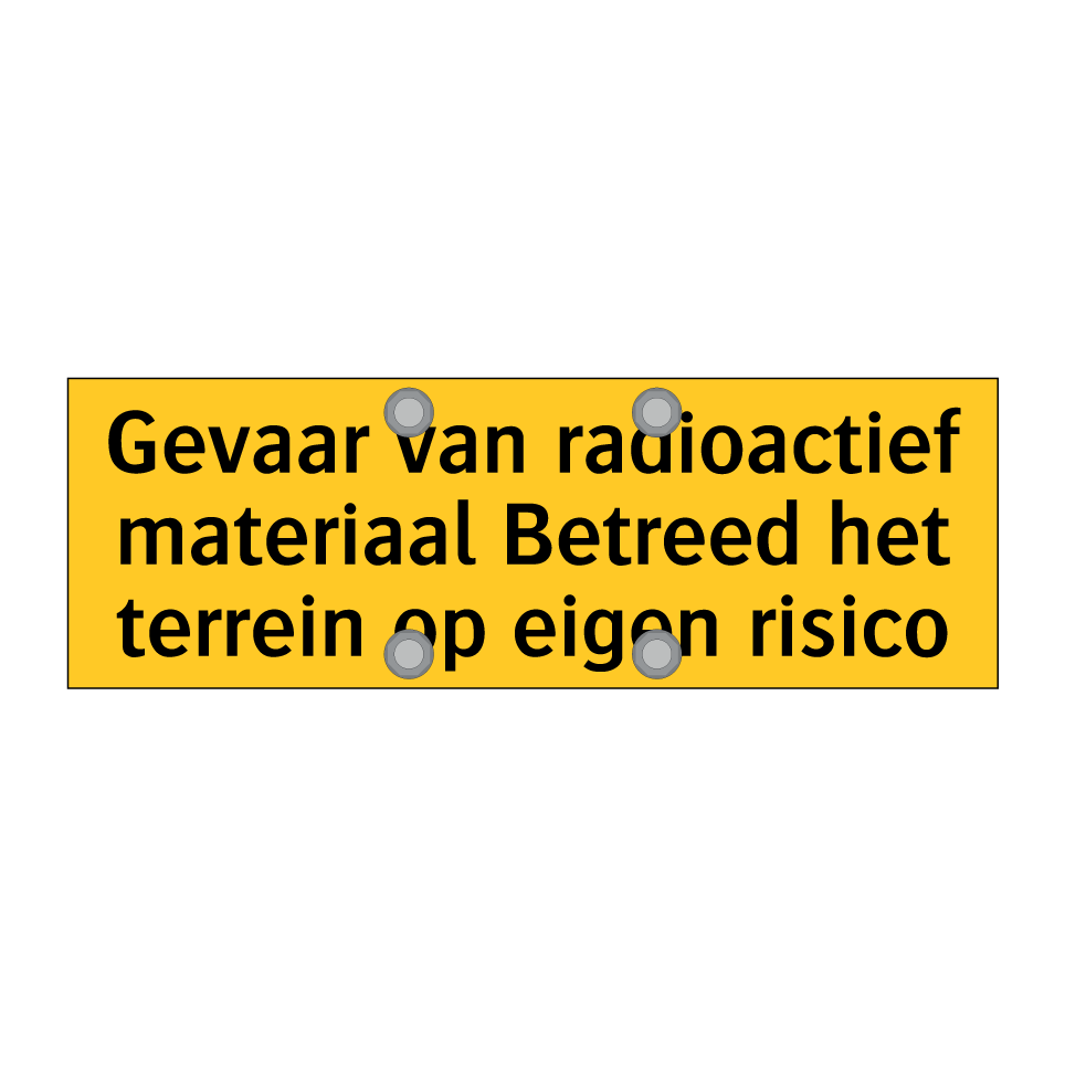 Deze waarschuwingsbord is essentieel voor het markeren van gebieden met radioactief materiaal. Het dient als een cruciale veiligheidsmaatregel om mensen te waarschuwen voor de potentiële gevaren en hen te informeren dat het betreden van het terrein op eigen risico is. Plaats deze bord op strategische locaties zoals ingangen van laboratoria, opslagruimtes voor nucleair afval, of andere zones waar radioactieve stoffen aanwezig zijn. Door de opvallende gele achtergrond en zwarte tekst trekt het direct de aandacht en zorgt het voor een duidelijke communicatie van het gevaar. Ideaal voor gebruik in industriële omgevingen, onderzoeksfaciliteiten en andere risicovolle gebieden.