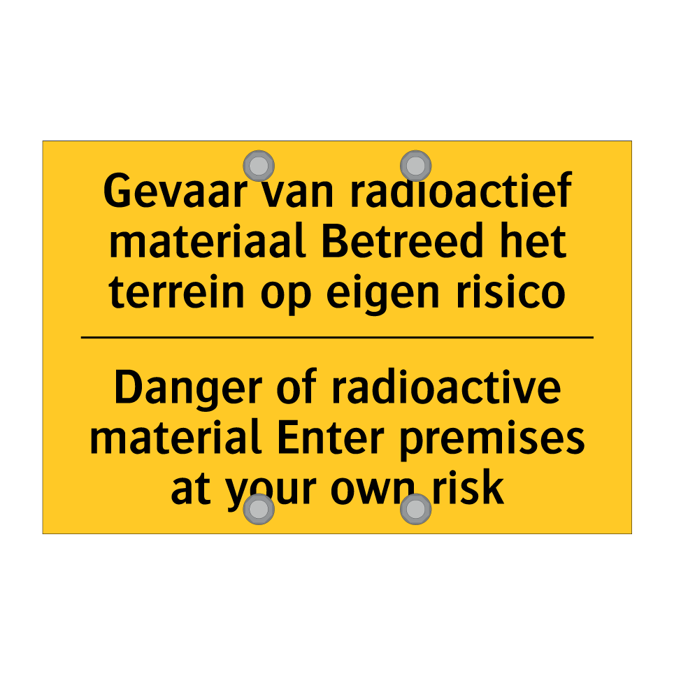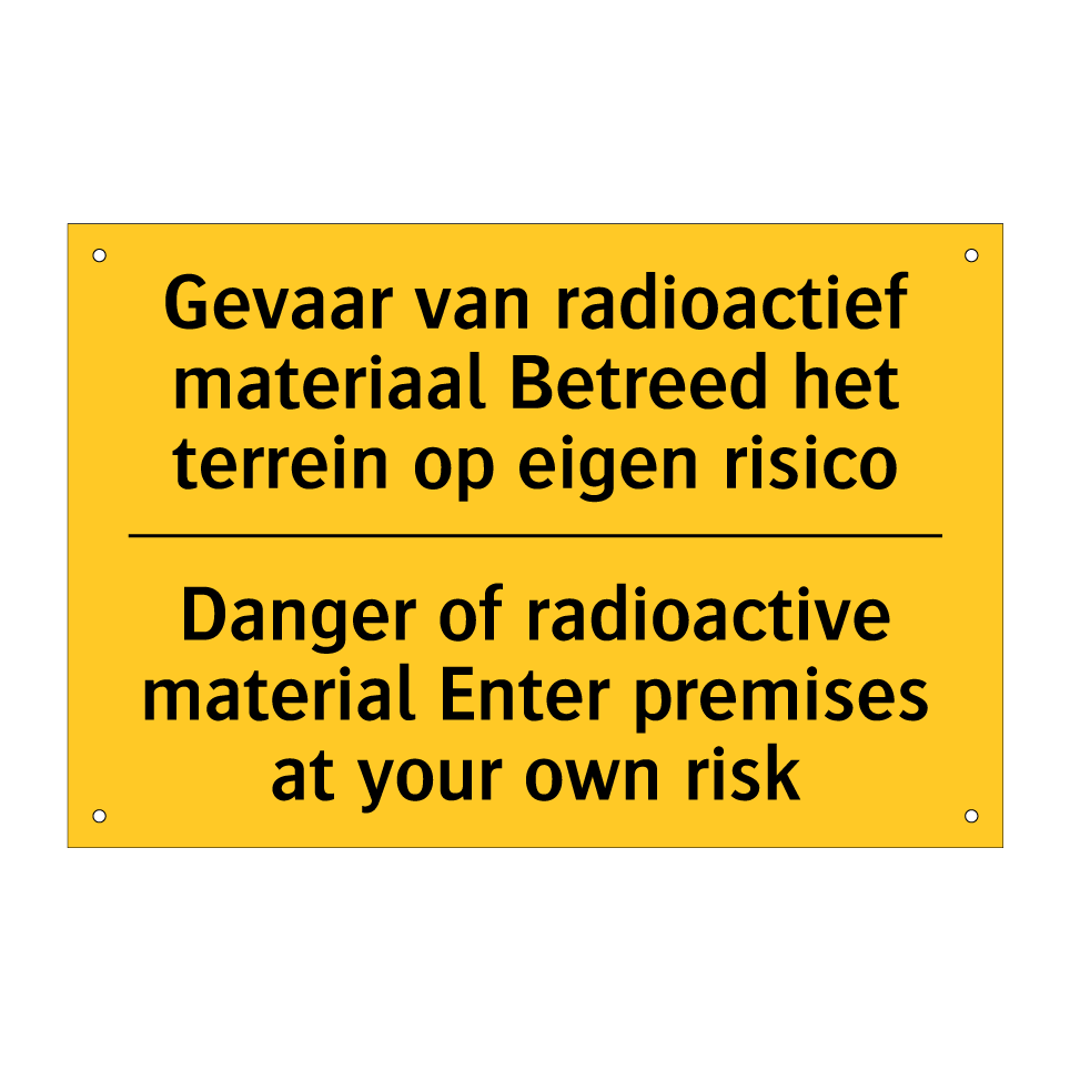 Waarschuwingsbord met de tekst Gevaar van radioactief materiaal Betreed het terrein op eigen risico / Danger of radioactive material Enter premises at your own risk