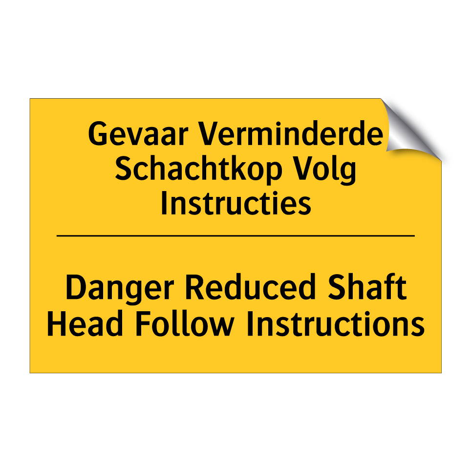 Waarschuwingsbord met de tekst Gevaar Verminderde Schachtkop Volg Instructies / Danger Reduced Shaft Head Follow Instructions