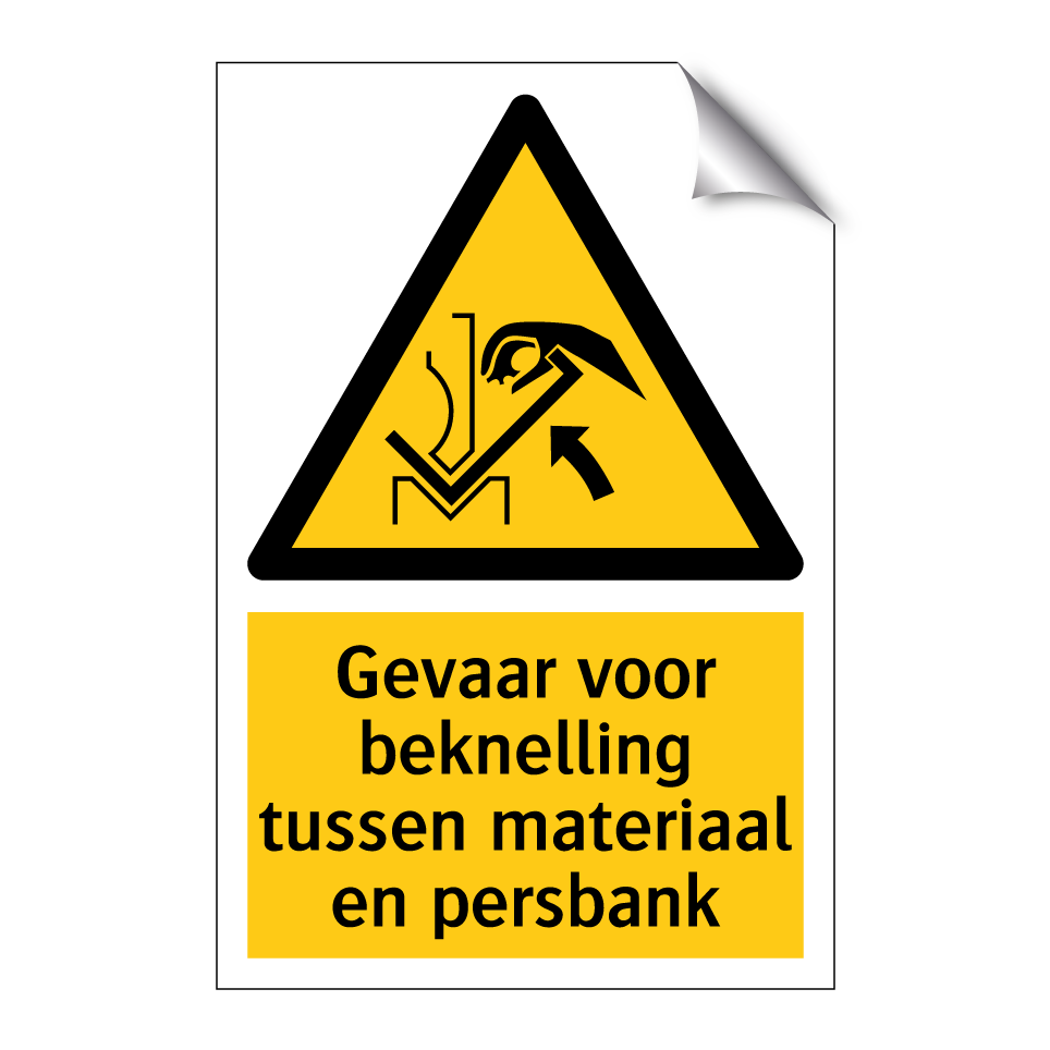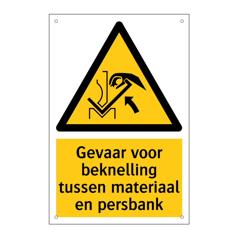 Waarschuwingsbord met de tekst Gevaar voor beknelling tussen materiaal en persbank