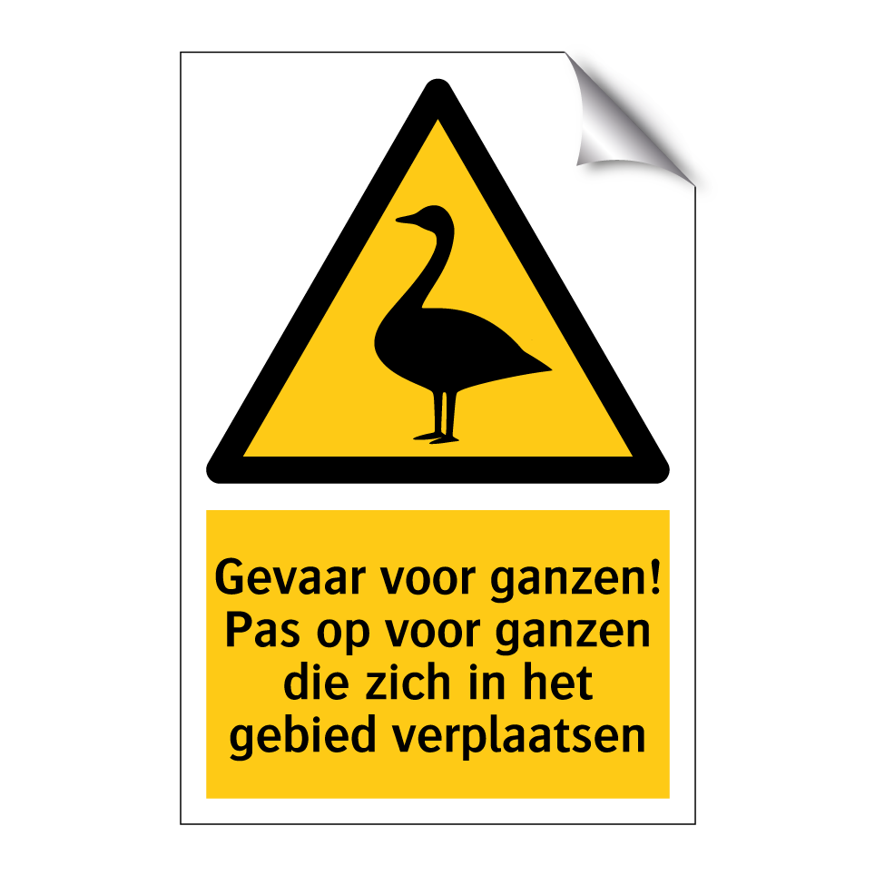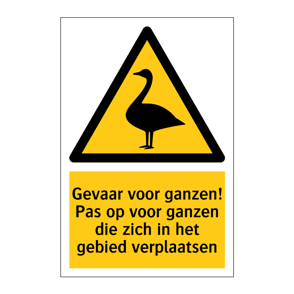 Waarschuwingsbord met de tekst Gevaar voor ganzen! Pas op voor ganzen die zich in het gebied verplaatsen