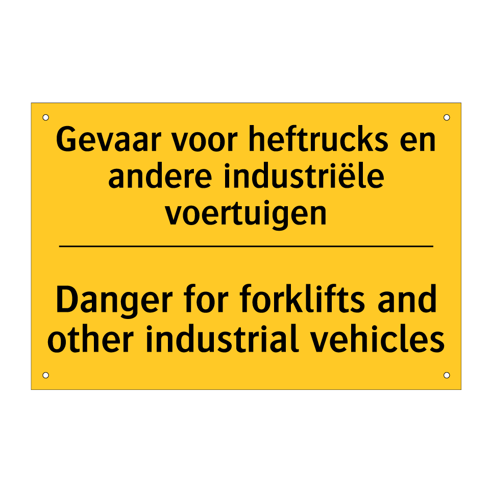 Dit waarschuwingsbord met gele achtergrond en zwarte tekst is ideaal voor gebruik in industriële omgevingen waar heftrucks en andere voertuigen actief zijn. De tweetalige tekst in zowel Nederlands als Engels zorgt ervoor dat zowel lokale als internationale medewerkers de waarschuwing begrijpen, wat de veiligheid op de werkvloer verhoogt. Plaats dit bordje op strategische locaties zoals magazijnen, laadperrons en fabrieksvloeren om werknemers en bezoekers te waarschuwen voor mogelijk gevaar. Dit waarschuwingsbord helpt ongelukken te voorkomen en bevordert een veilige werkomgeving door duidelijk te communiceren over de aanwezigheid van industriële voertuigen.