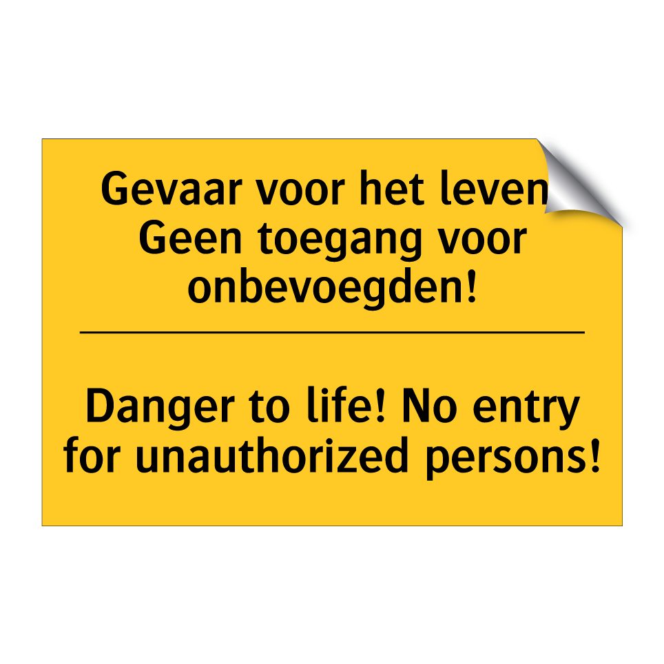 Waarschuwingsbord met de tekst Gevaar voor het leven! Geen toegang voor onbevoegden! / Danger to life! No entry for unauthorized persons!