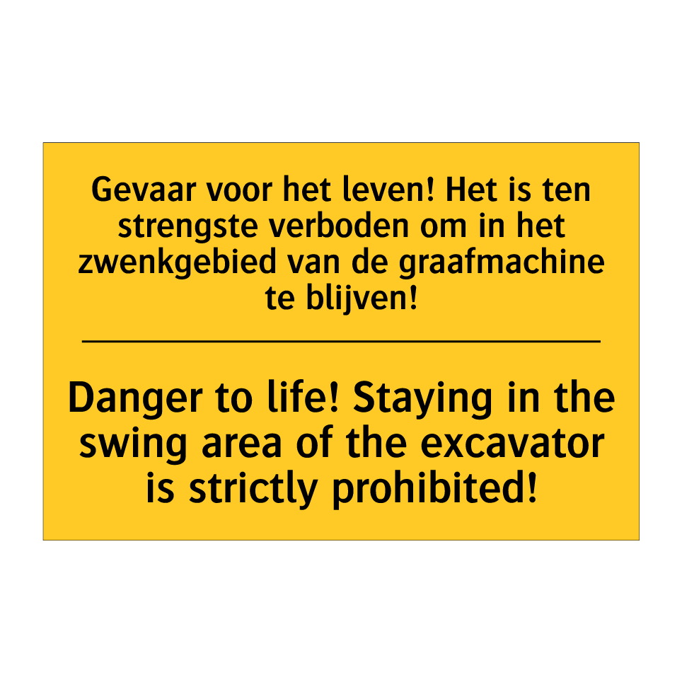 Waarschuwingsbord met de tekst Gevaar voor het leven! Het is ten strengste verboden om in het zwenkgebied van de graafmachine te blijven! / Danger to life! Staying in the swing area of the excavator is strictly prohibited!