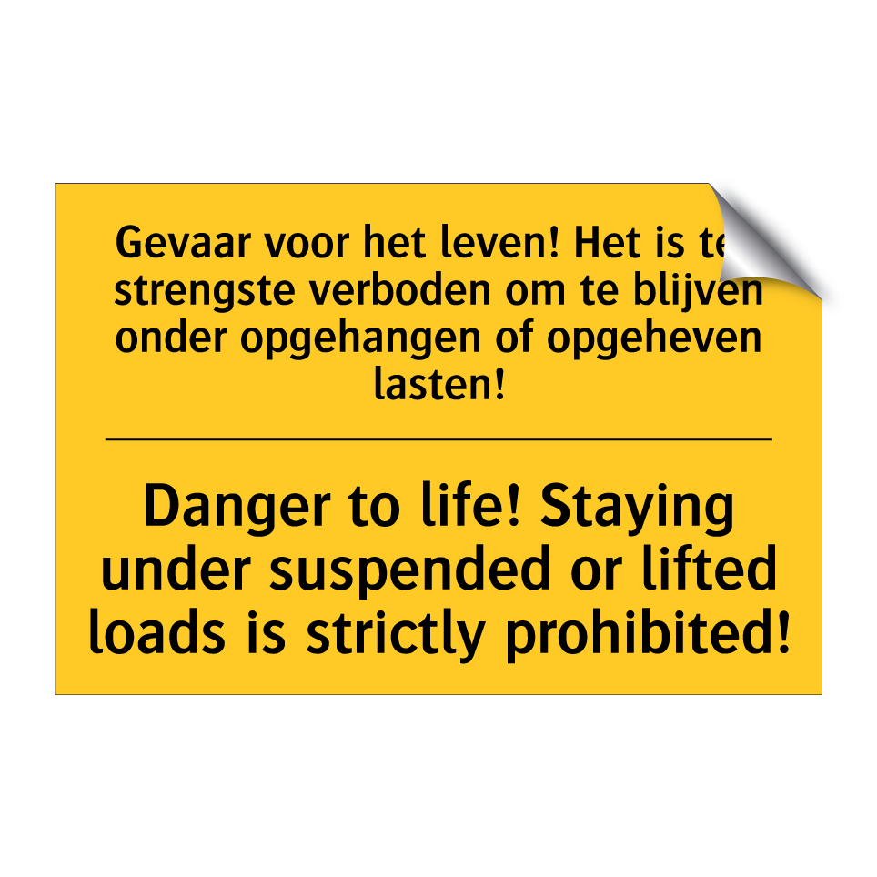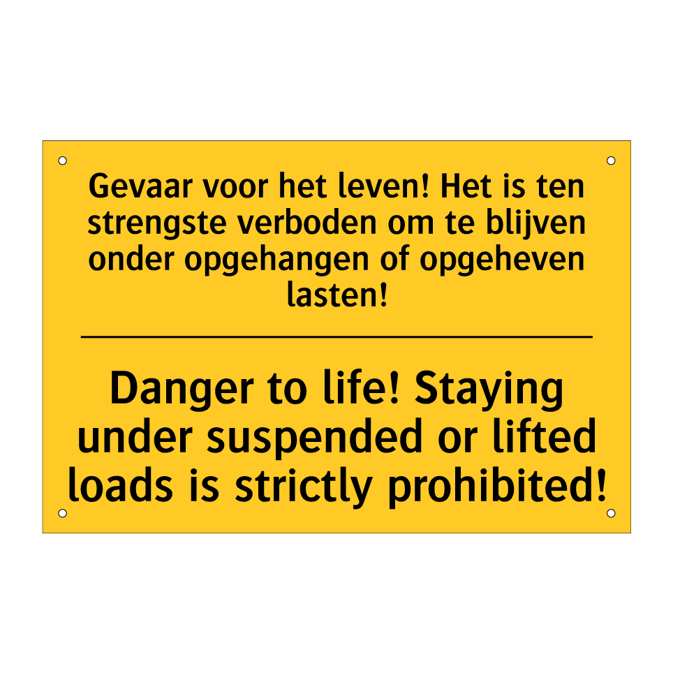 Waarschuwingsbord met de tekst Gevaar voor het leven! Het is ten strengste verboden om te blijven onder opgehangen of opgeheven lasten! / Danger to life! Staying under suspended or lifted loads is strictly prohibited!