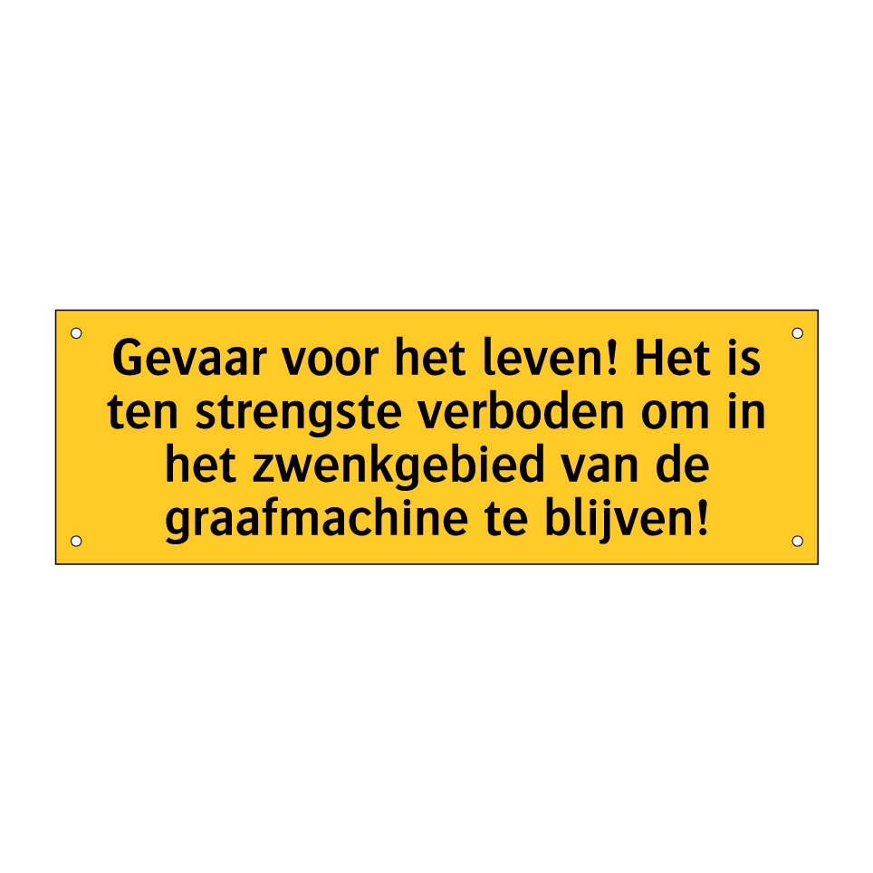 Waarschuwingsbord met de tekst Gevaar voor het leven! Het is ten strengste verboden om in het zwenkgebied van de graafmachine te blijven!
