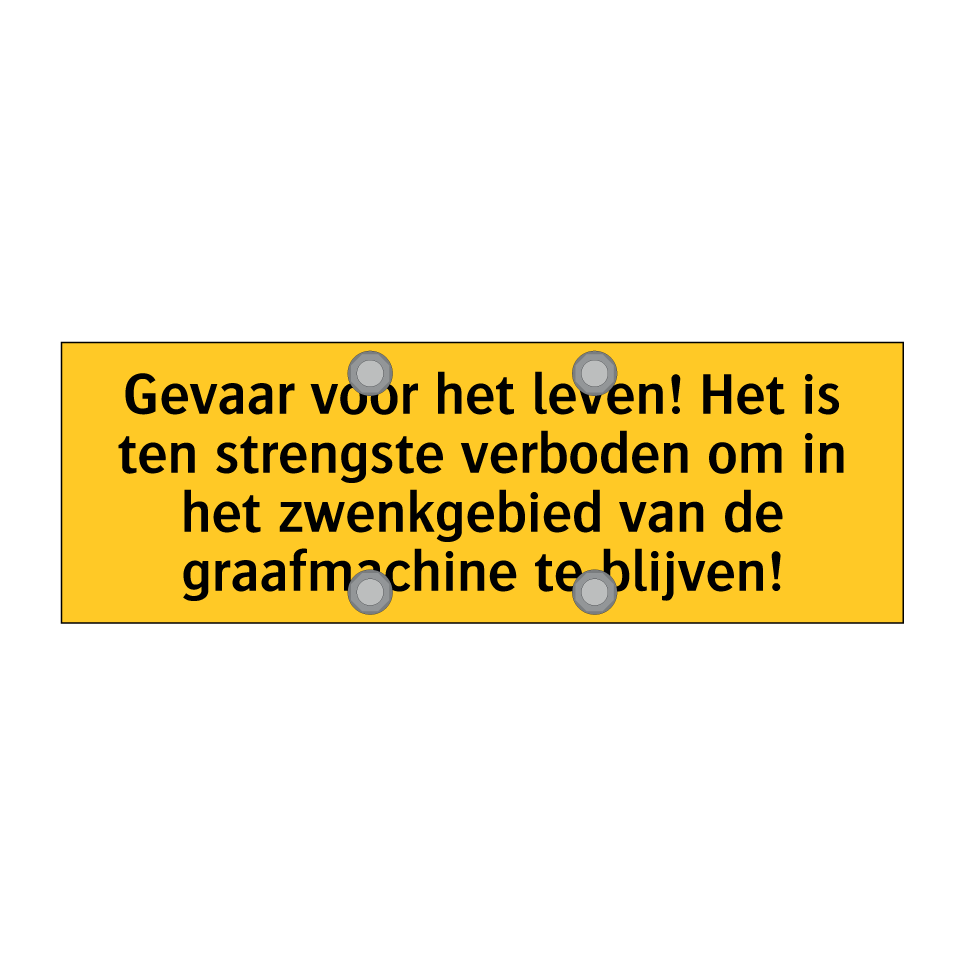 Deze waarschuwingsbord is essentieel voor het waarborgen van de veiligheid op bouwplaatsen en industriële terreinen. Het waarschuwt voor levensgevaar en benadrukt het strikte verbod om in het draaigebied van de graafmachine te blijven. Plaats deze bord op strategische locaties rondom graafmachines en andere zware machines om werknemers en bezoekers te beschermen tegen potentieel gevaarlijke situaties. Door de opvallende gele achtergrond en zwarte tekst is de waarschuwing duidelijk zichtbaar, zelfs van een afstand. Dit waarschuwingsbord helpt bij het voorkomen van ongelukken en bevordert een veilige werkomgeving.