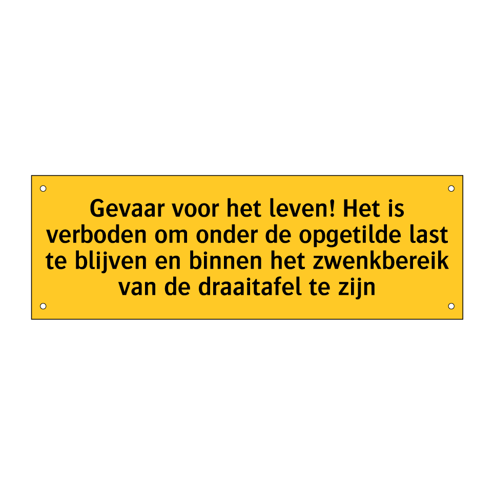 Waarschuwingsbord met de tekst Gevaar voor het leven! Het is verboden om onder de opgetilde last te blijven en binnen het zwenkbereik van de draaitafel te zijn