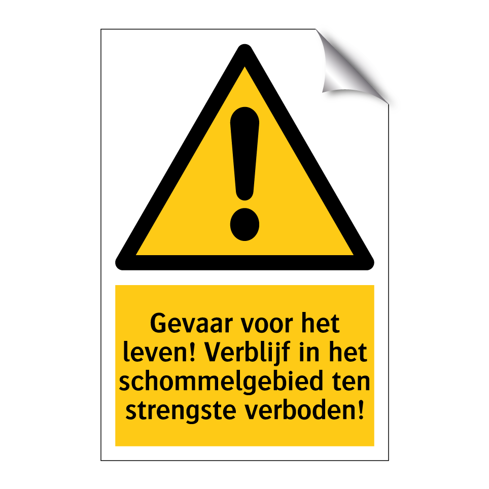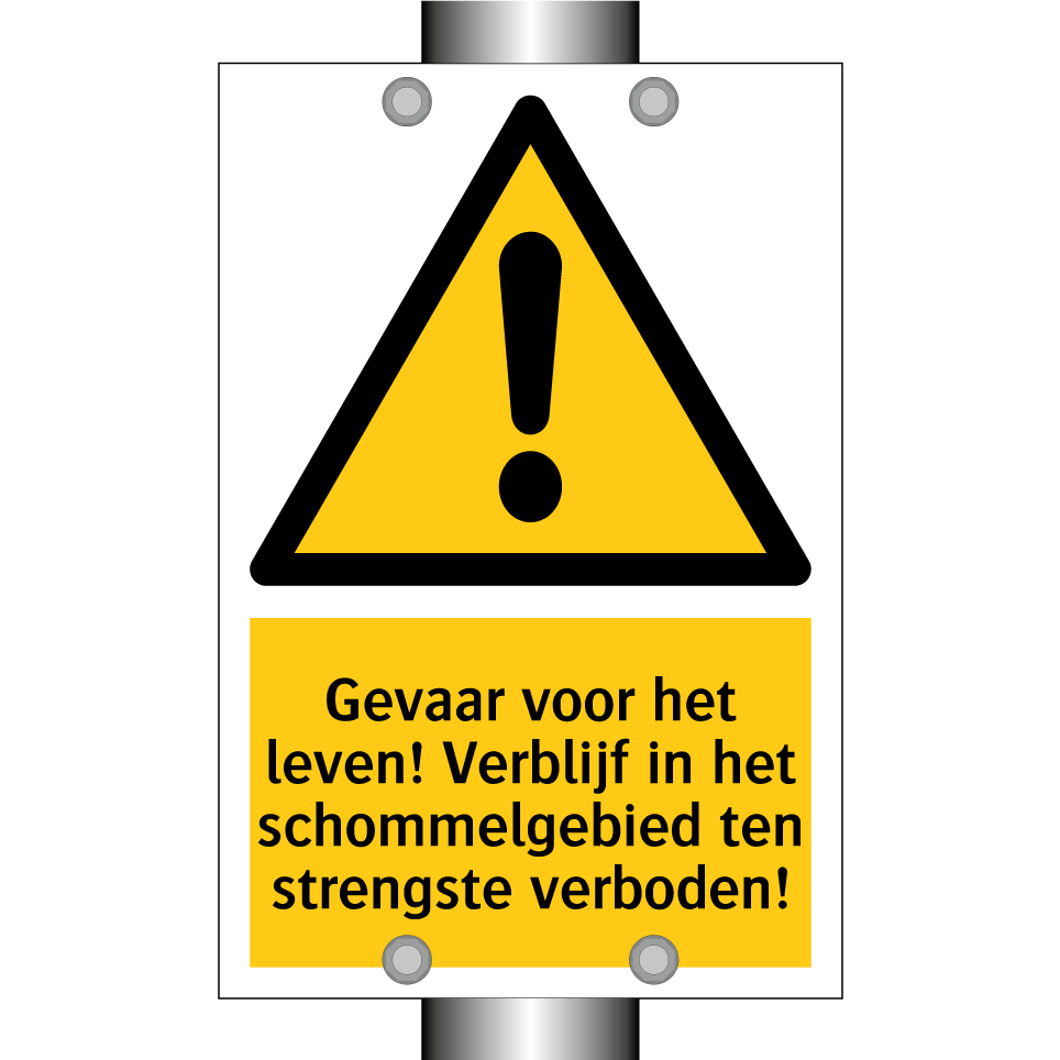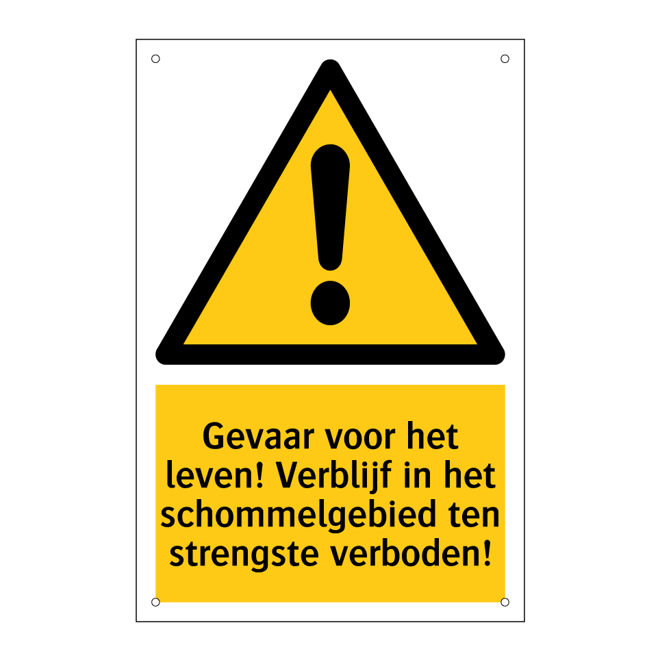 Deze waarschuwingsbord is essentieel voor het waarborgen van de veiligheid in risicovolle gebieden. Het bord waarschuwt duidelijk voor levensgevaar en verbiedt strikt het verblijf in het schommelgebied. Ideaal voor gebruik op bouwplaatsen, industriële terreinen, en andere gevaarlijke zones waar onbevoegden niet mogen komen. Plaats dit bordje op goed zichtbare locaties zoals ingangen, hekken, en nabij machines om ervoor te zorgen dat iedereen op de hoogte is van de gevaren. Door het strategisch plaatsen van dit waarschuwingsbord, kunt u ongelukken voorkomen en een veilige omgeving handhaven.