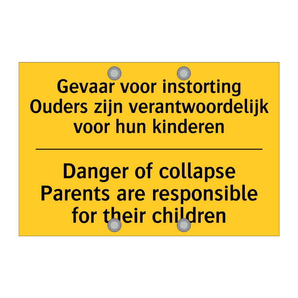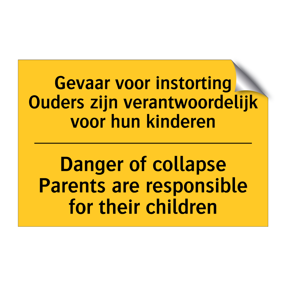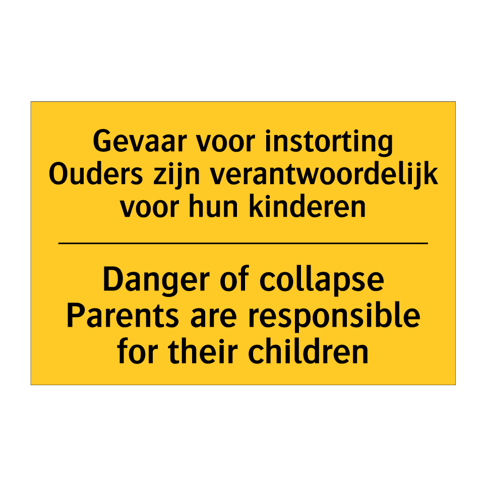 Waarschuwingsbord met de tekst Gevaar voor instorting Ouders zijn verantwoordelijk voor hun kinderen / Danger of collapse Parents are responsible for their children