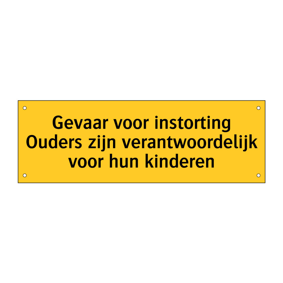 Waarschuwingsbord met de tekst Gevaar voor instorting Ouders zijn verantwoordelijk voor hun kinderen