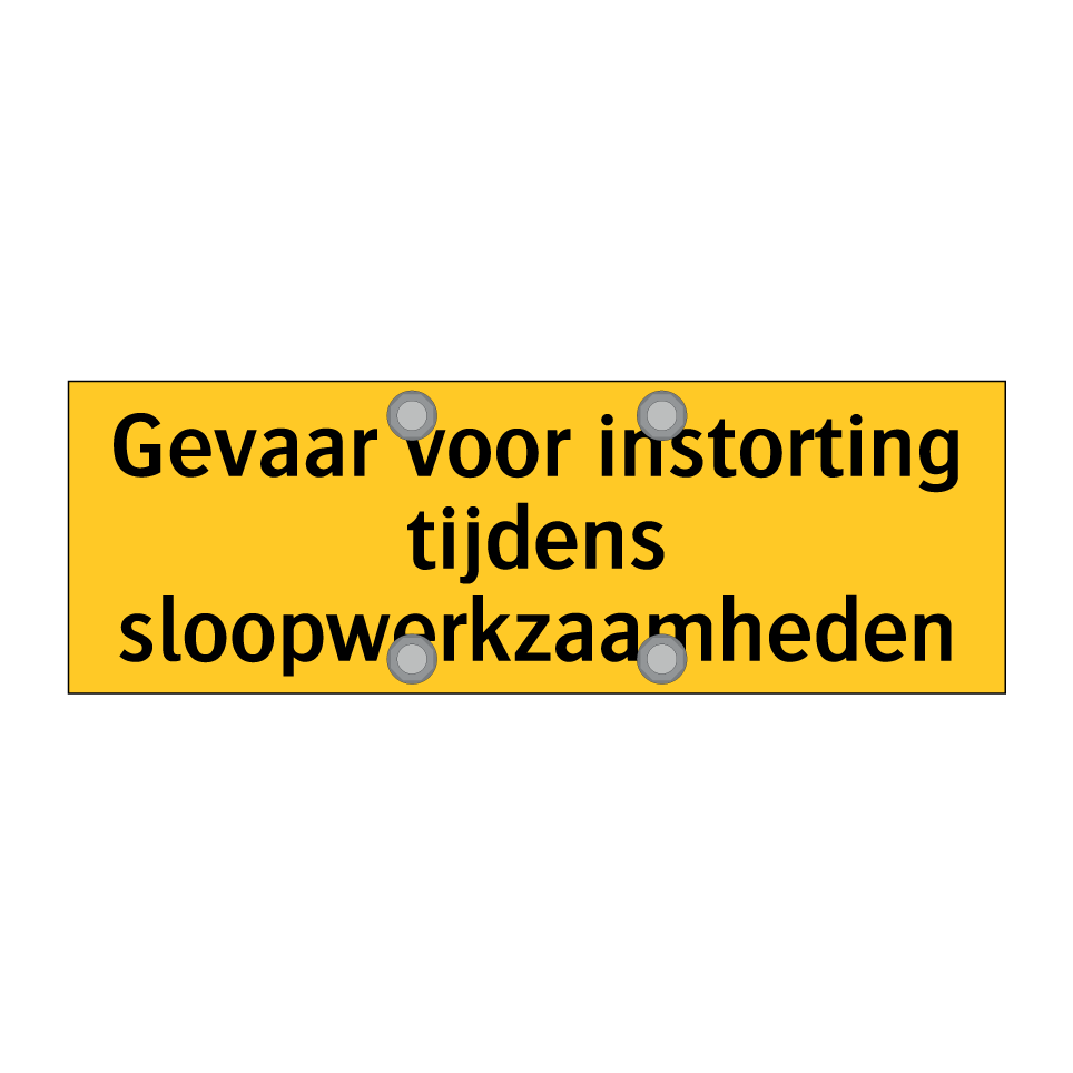 Deze waarschuwingsbord is essentieel voor bouwplaatsen en slooplocaties waar instortingsgevaar aanwezig is. Plaats deze bord op goed zichtbare plekken om arbeiders en bezoekers te waarschuwen voor de risico's tijdens sloopwerkzaamheden. Door de opvallende gele achtergrond en zwarte tekst trekt deze bord direct de aandacht, wat cruciaal is voor de veiligheid. Gebruik deze waarschuwingsbord bij ingangen, hekken, en andere strategische locaties om ervoor te zorgen dat iedereen op de hoogte is van het instortingsgevaar. Deze bord helpt ongelukken te voorkomen en zorgt voor een veilige werkomgeving.