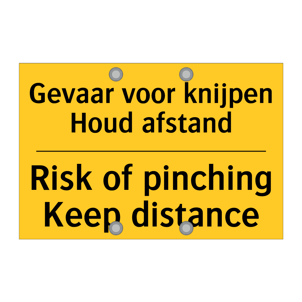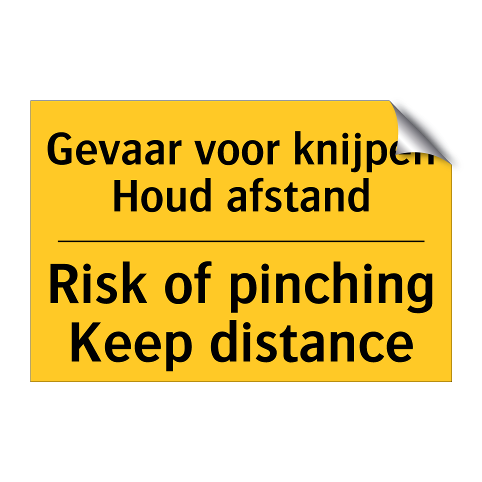 Waarschuwingsbord met de tekst Gevaar voor knijpen Houd afstand / Risk of pinching Keep distance