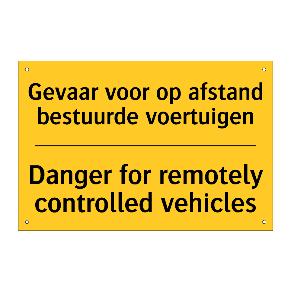 Waarschuwingsbord met de tekst Gevaar voor op afstand bestuurde voertuigen / Danger for remotely controlled vehicles