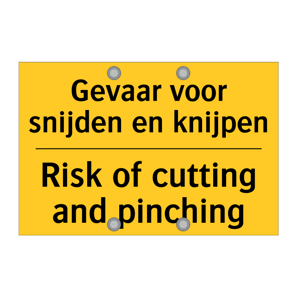 Waarschuwingsbord met de tekst Gevaar voor snijden en knijpen / Risk of cutting and pinching