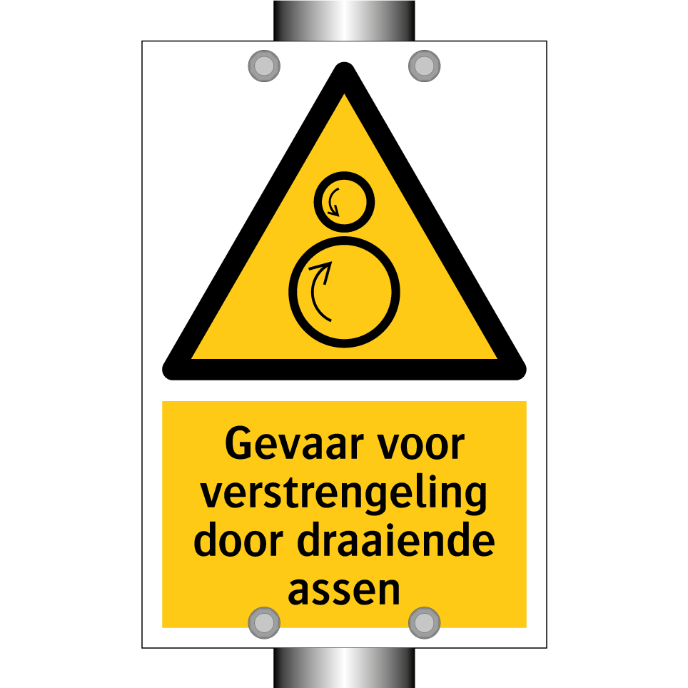 Waarschuwingsbord met de tekst Gevaar voor verstrengeling door draaiende assen